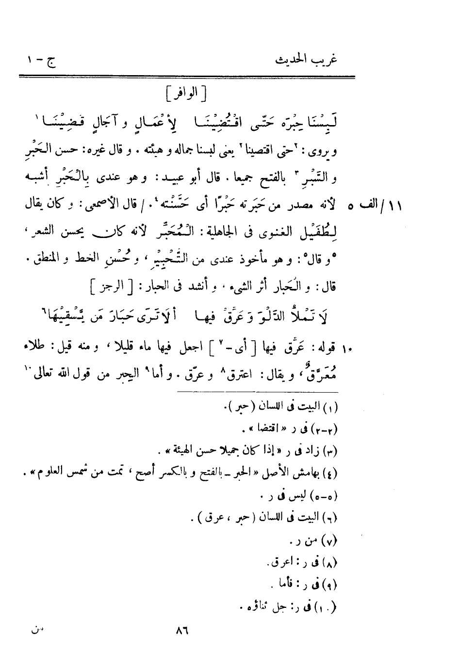 ويروى: حَتَّى اقتصينا يَعْنِي لبسنا جماله وهيئته. وَقَالَ غَيره: حسن الحبر والسبر بِالْفَتْح جَمِيعًا. قَالَ أَبُو عُبَيْدٍ: وَهُوَ عِنْدِي بالحبر أشبه / الف لِأَنَّهُ مصدر من حبرته حبرًا أَي حسنته. / قَالَ الْأَصْمَعِي: وَكَانَ يُقَال لطفيل الغنوي فِي الْجَاهِلِيَّة: المحبر لِأَنَّهُ كَانَ يحسن الشّعْر وَقَالَ: وَهُوَ مَأْخُوذ عِنْدِي من التَّحْبِيْرِ وَحسن الْخط والمنطق. قَالَ: والحبار أثر الشَّيْء. وَأنْشد فِي الحبار: [الرجز]