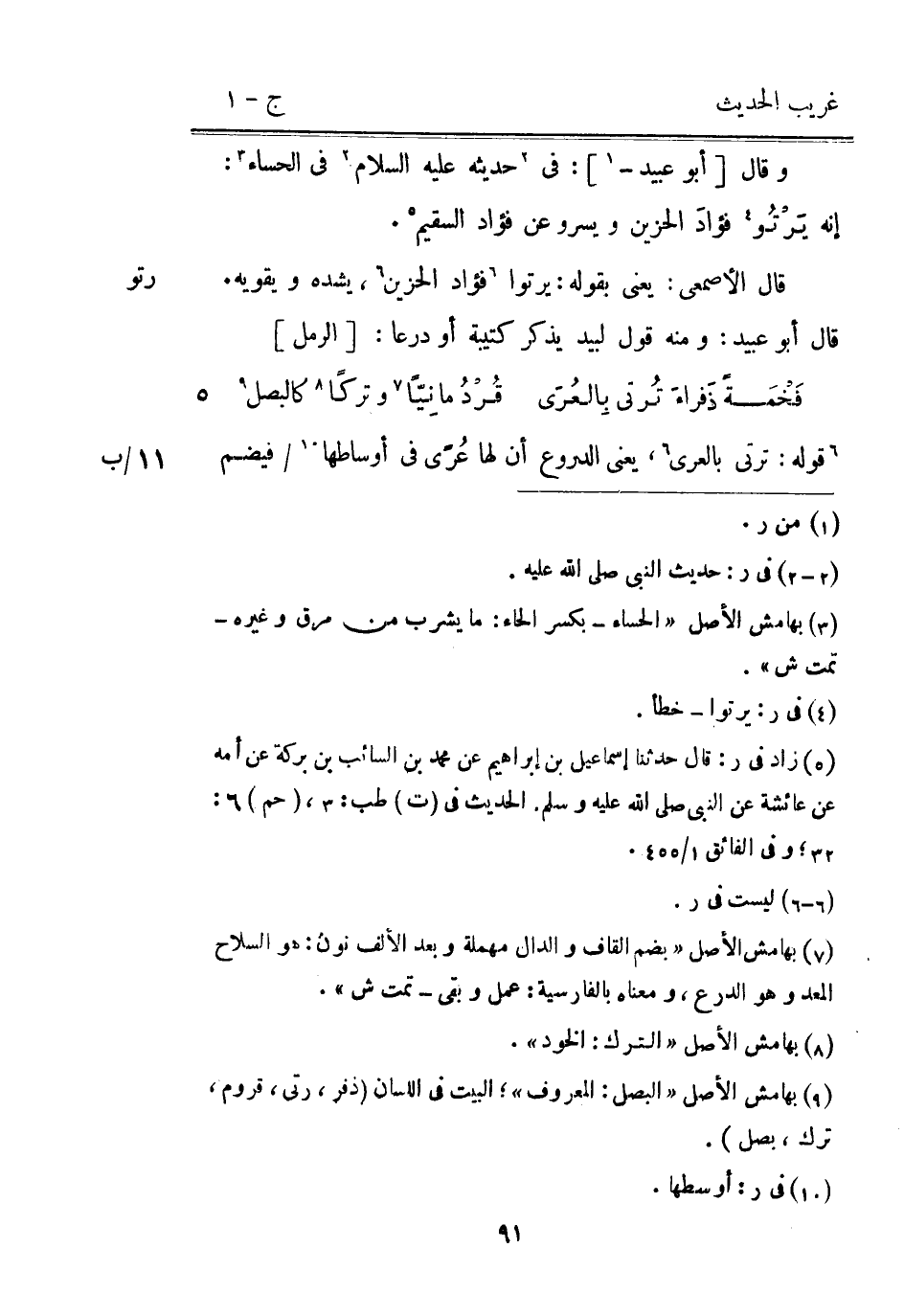 رتو وَقَالَ [أَبُو عُبَيْد -] : فِي حَدِيثه عَلَيْهِ السَّلَام فِي الحساء: إِنَّه يَرتُو فؤاد الحزين ويسرو عَن فؤاد السقيم. قَالَ الْأَصْمَعِي: يَعْنِي بقوله: يرتوا 6 فؤاد الحزين يشده ويقويه.