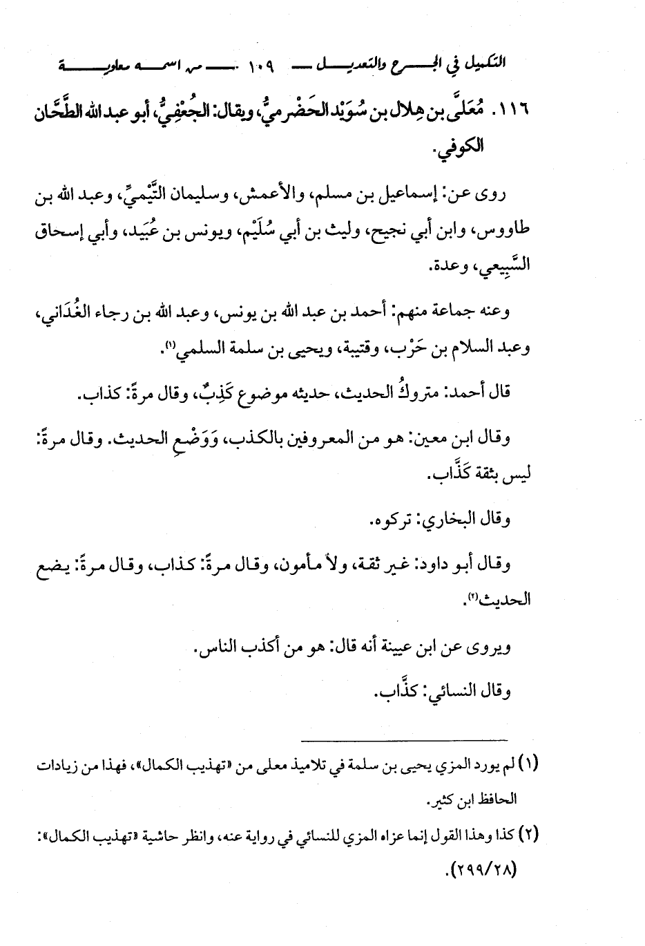 116 - مُعَلَّى بن هِلال بن سُوَيْد الحَضْرميُّ، ويقال: الجُعْفِيُّ، أبو عبد الله الطَّحَّان الكوفي.