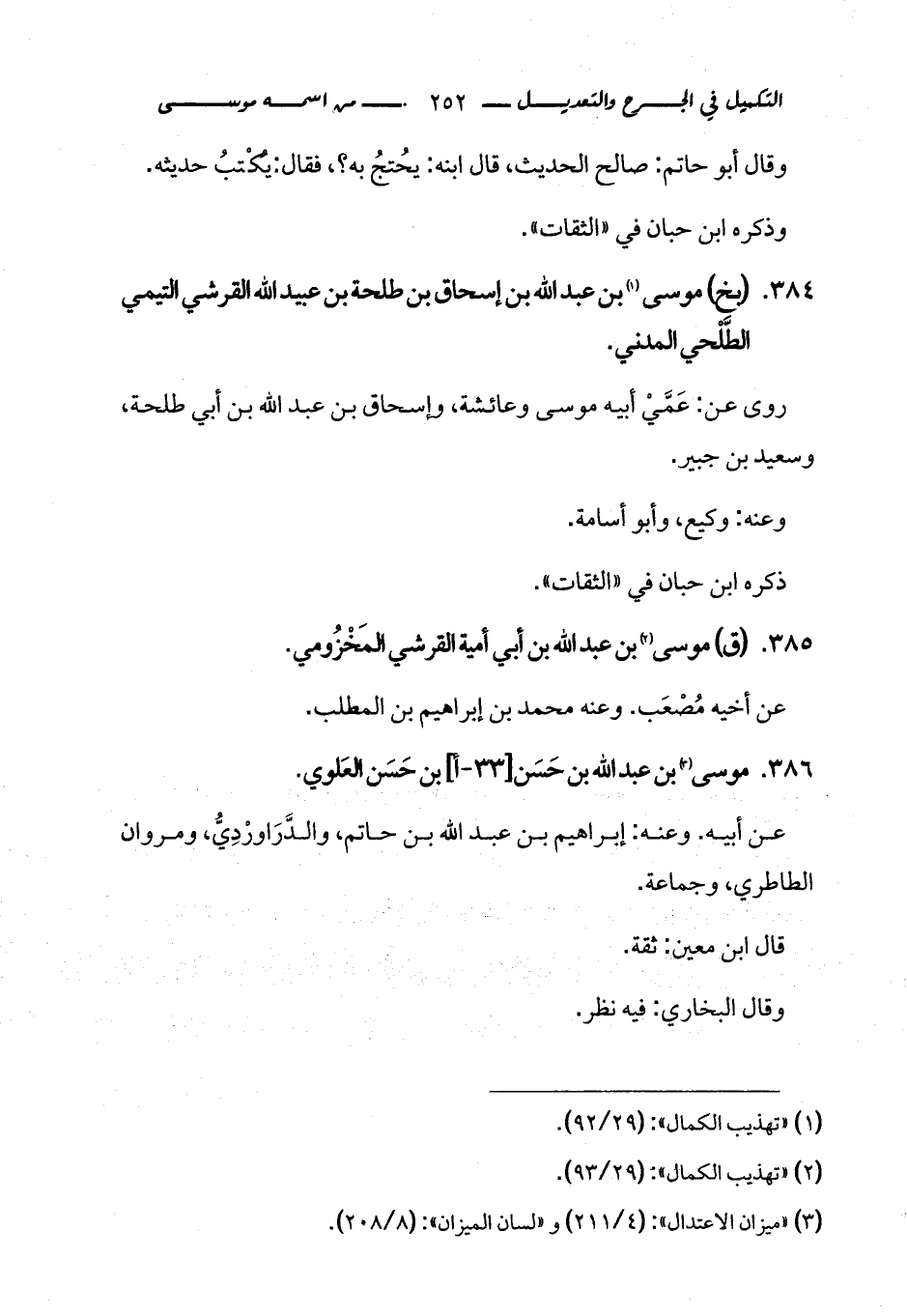 384 - (بخ) موسى (¬1) بن عبد الله بن إسحاق بن طلحة بن عبيد الله القرشي التيمي الطَّلْحي المدني.