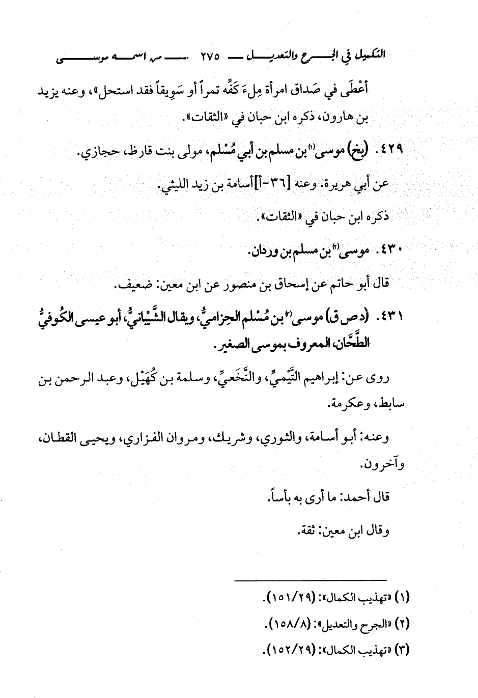 431 - (د ص ق) موسى (¬3) بن مُسْلم الحِزاميُّ، ويقال الشَّيْبانيُّ، أبو عيسى الكُوفيُّ الطَّحَّان، المعروف بموسى الصغير.