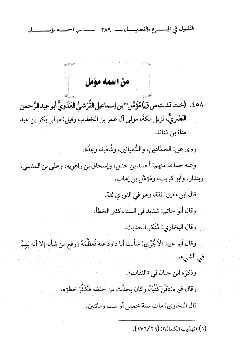 458 - (خت قد ت س ق) مُؤَمَّل (¬1) بن إسماعيل القُرَشيُّ العَدَويُّ أبو عبد الرَّحمن البَصْريُّ، نزيل مكةَ، مولى آل عمر بن الخطاب وقيل: مولى بكر بن عبد مناة بن كنانة.