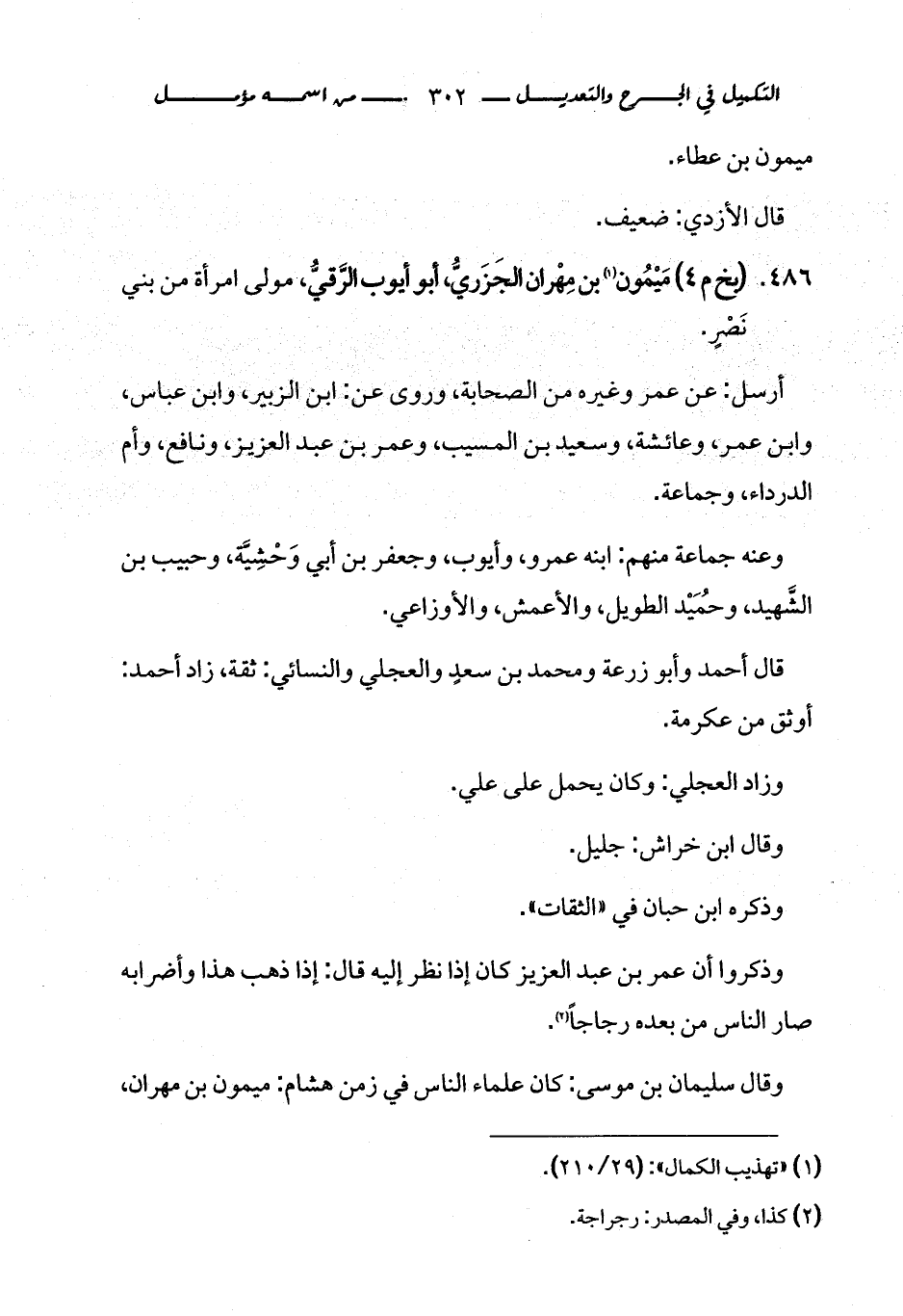 486 - (بخ م 4) مَيْمُون (¬1) بن مِهْران الجَزَريُّ، أبو أيوب الرَّقيُّ، مولى امرأة من بني نَصْرٍ.