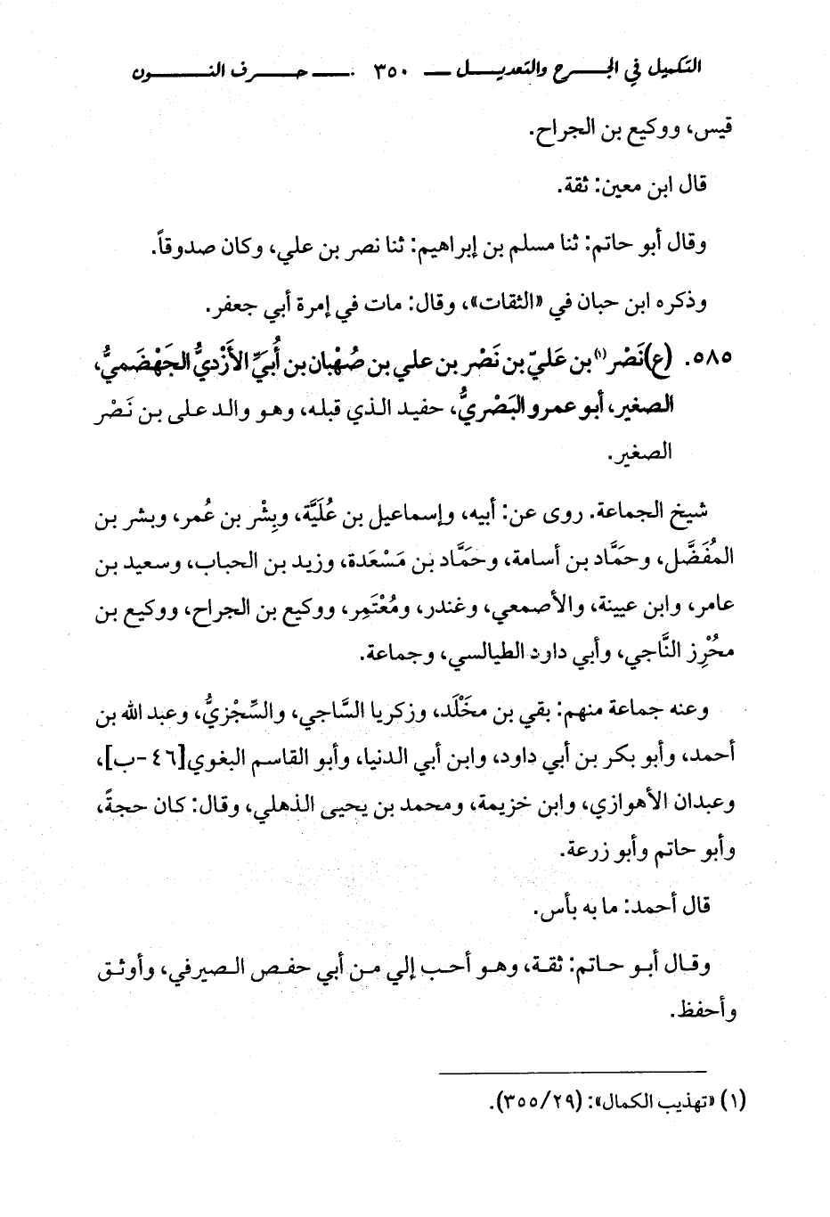 585 - (ع) نَصْر (¬1) بن عَليّ بن نَصْر بن علي بن صُهْبان بن أُبَيِّ الأَزْديُّ الجَهْضَميُّ، الصغير، أبو عمرو البَصْريُّ، حفيد الذي قبله، وهو والد على بن نَصْر الصغير.