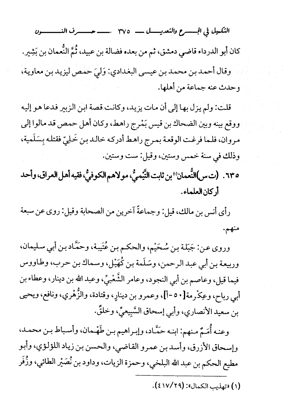 635 - (ت س) النُّعمان (¬1) بن ثابت التَّيْميُّ، مولاهم الكوفيُّ، فقيه أهل العراق، وأحد أركان العلماء.