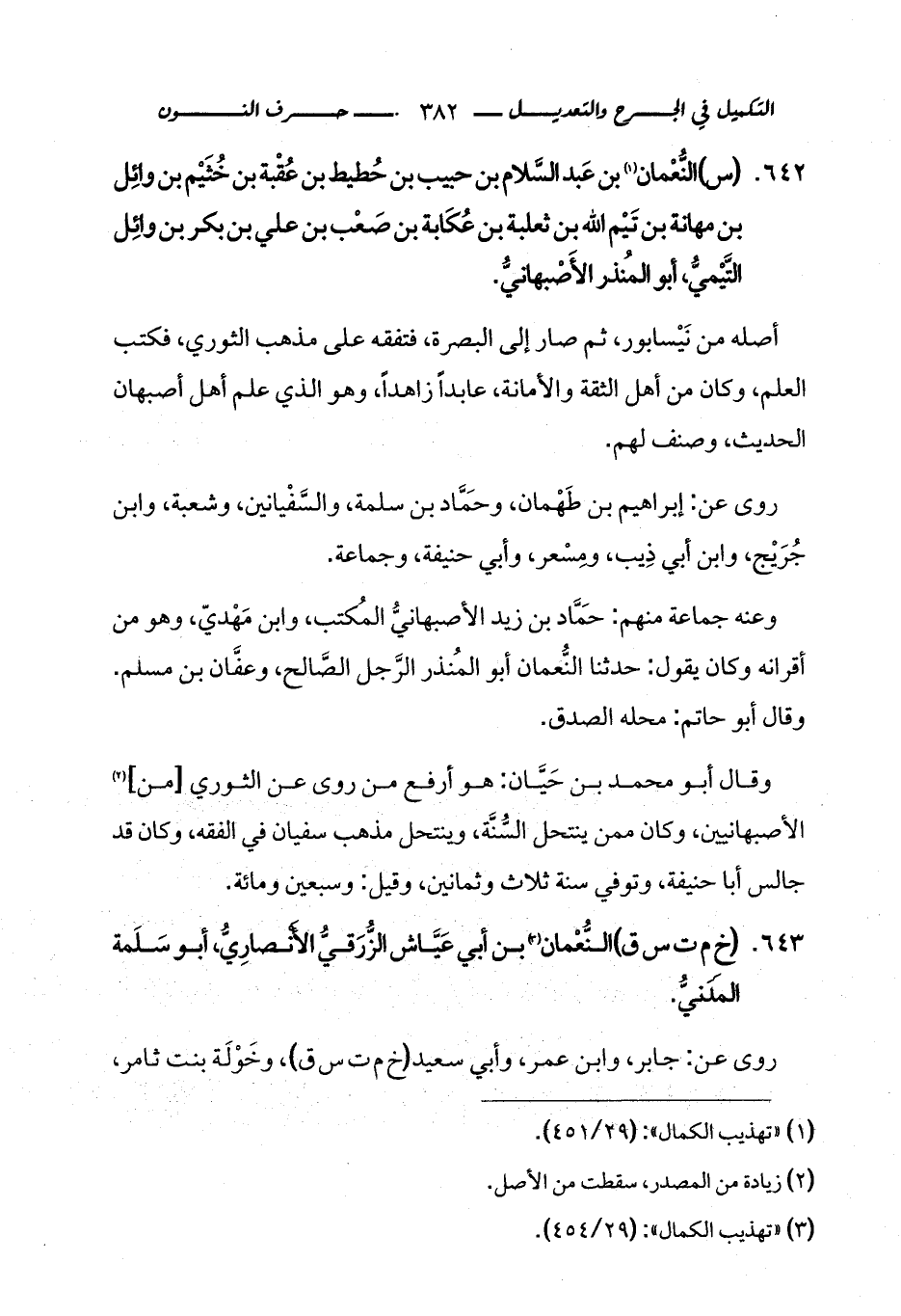 642 - (س) النُّعْمان (¬1) بن عَبد السَّلام بن حبيب بن حُطيط بن عُقْبة بن خُثَيْم بن وائِل بن مهانة بن تَيْم الله بن ثعلبة بن عُكَابة بن صَعْب بن علي بن بكر بن وائِل التَّيْميُّ، أبو المُنذر الأَصْبهانيُّ.