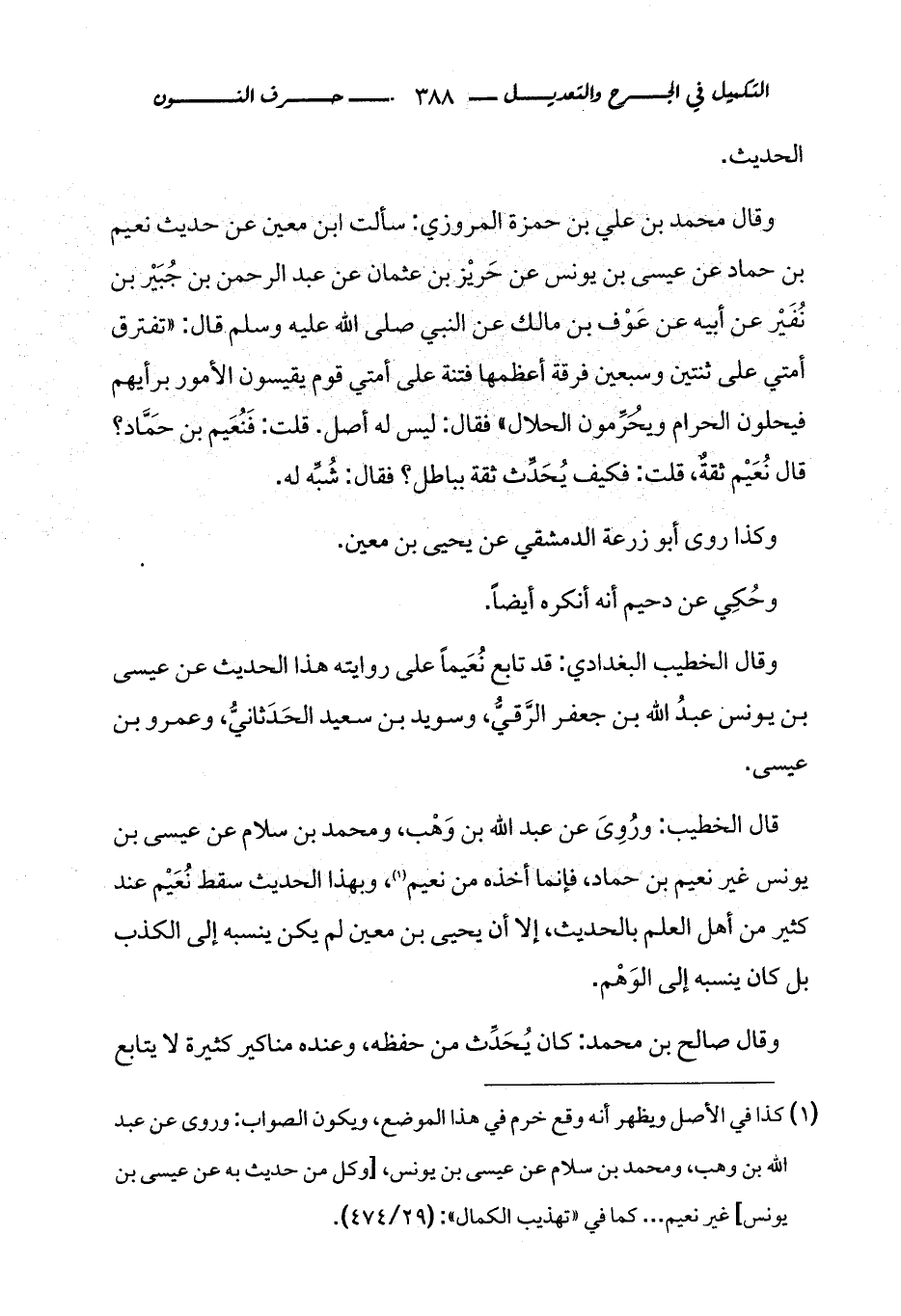 قال الخطيب: ورُوِىَ عن عبد الله بن وَهْب، ومحمد بن سلام عن عيسى بن يونس غير نعيم بن حماد، فإنما أخذه من نعيم (¬1)، وبهذا الحديث سقط نُعَيْم عند كثير من أهل العلم بالحديث، إلا أن يحيى بن معين لم يكن ينسبه إلى الكذب بل كان ينسبه إلى الوَهْم.