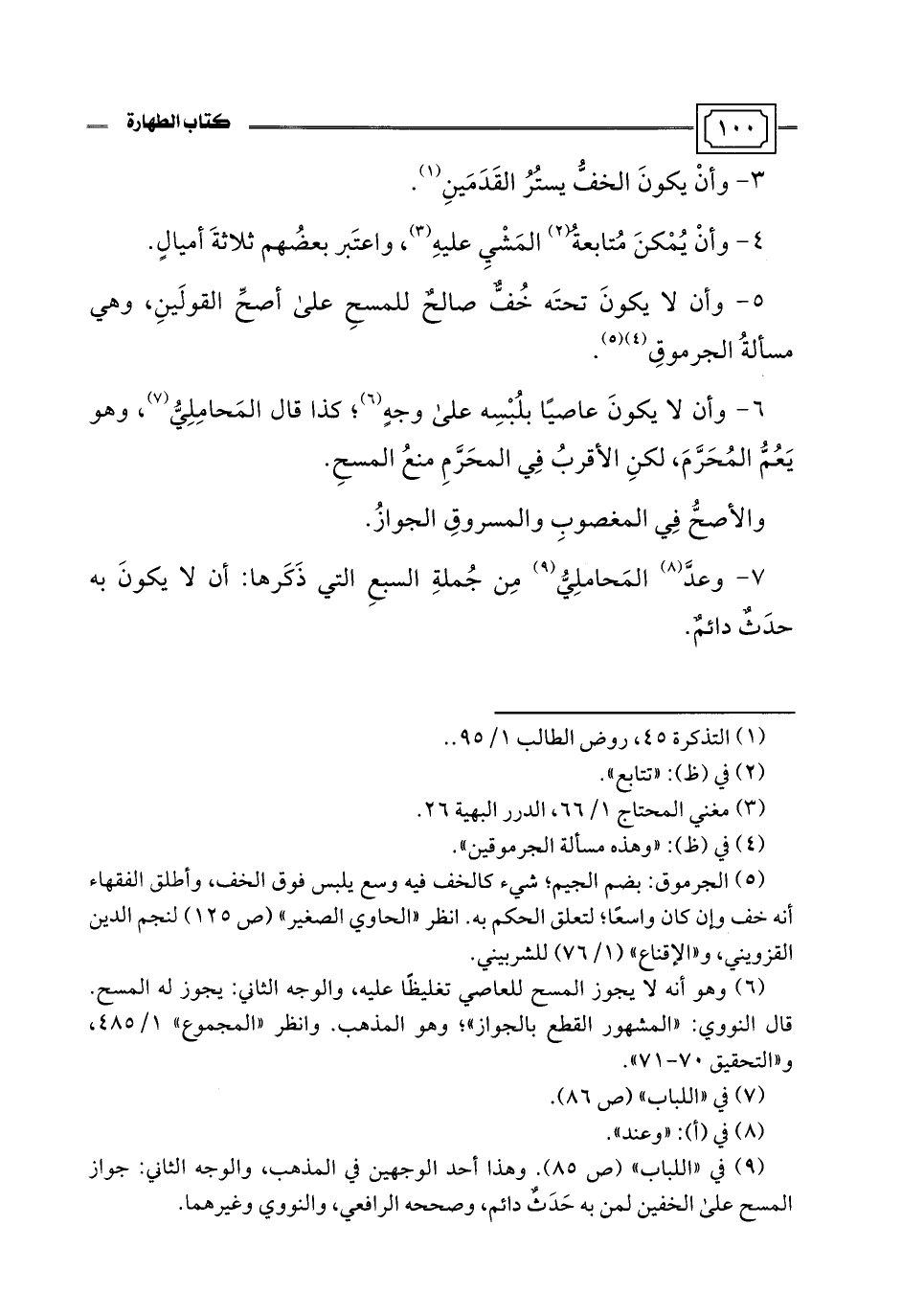 (¬6) وهو أنه لا يجوز المسح للعاصي تغليظًا عليه، والوجه الثاني: يجوز له المسح. قال النووي: "المشهور القطع بالجواز"؛ وهو المذهب. وانظر "المجموع" 1/ 485، و"التحقيق 70 - 71".