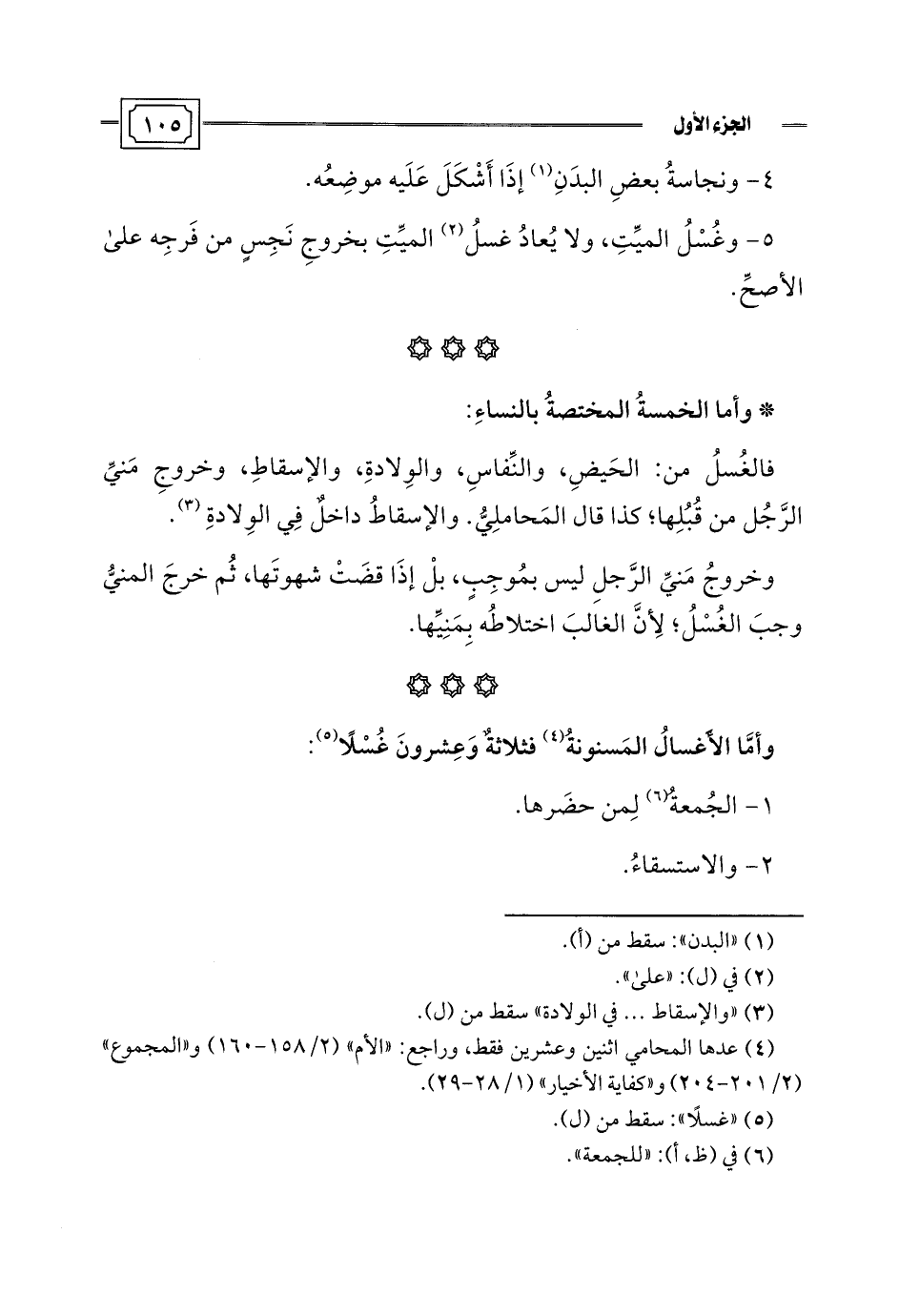 فالغُسلُ من: الحَيضِ، والنِّفاسِ، والوِلادةِ، والإسقاطِ، وخروجِ مَنيِّ الرَّجُل من قُبُلِها؛ كذا قال المَحاملِيُّ. والإسقاطُ داخلٌ فِي الوِلادةِ (¬3).