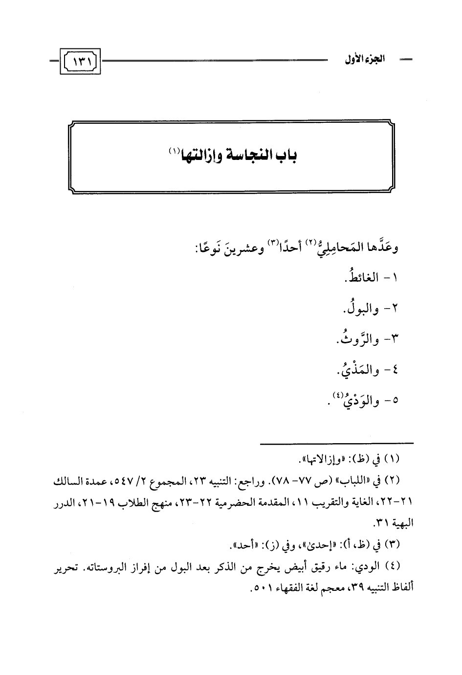 (¬2) في "اللباب" (ص 77 - 78). وراجع: التنبيه 23، المجموع 2/ 547، عمدة السالك 21 - 22، الغاية والتقريب 11، المقدمة الحضرمية 22 - 23، منهج الطلاب 19 - 21، الدرر البهية 31.
