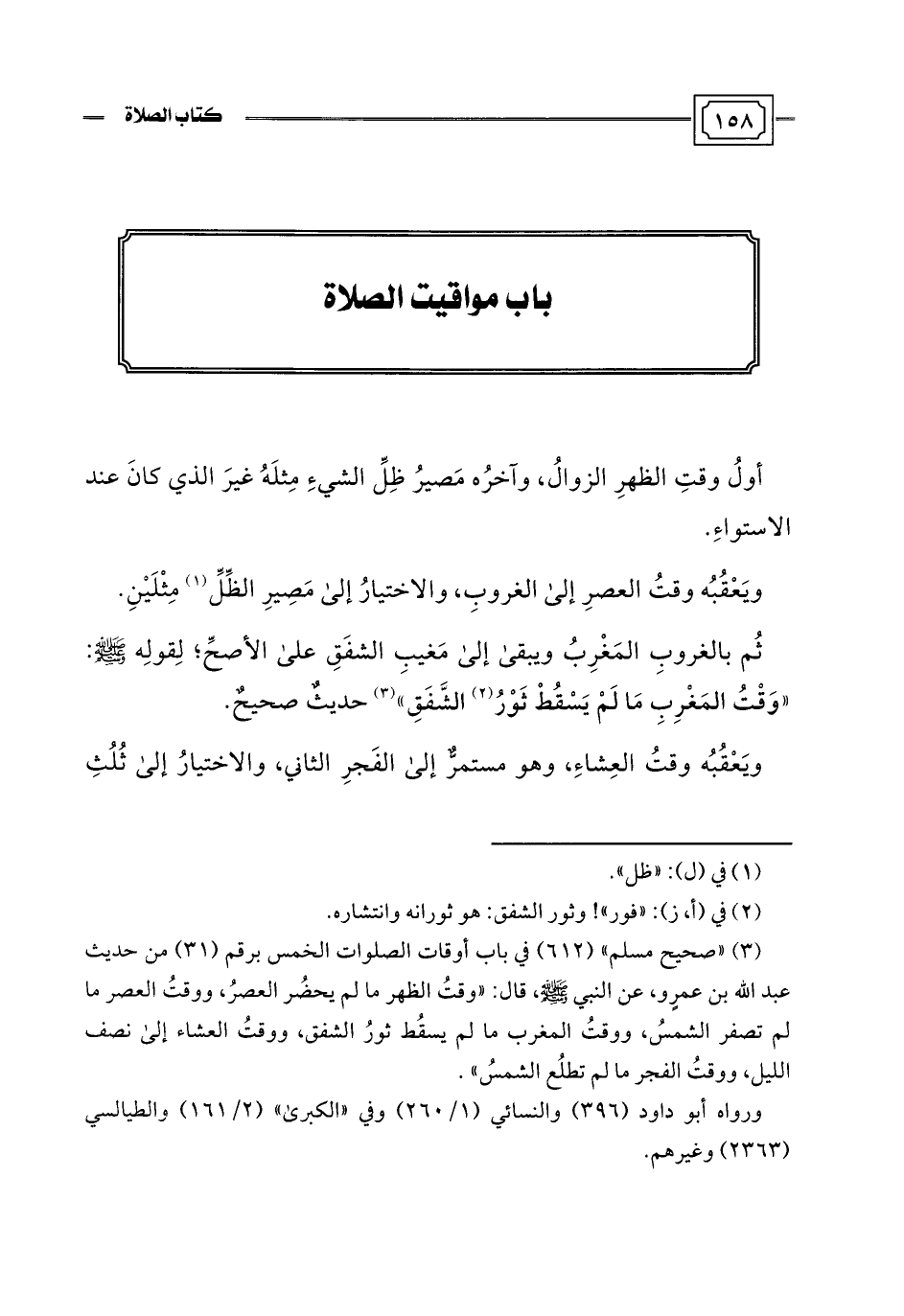 (¬3) "صحيح مسلم" (612) في باب أوقات الصلوات الخمس برقم (31) من حديث عبد اللَّه بن عمرٍو، عن النبي -صلى اللَّه عليه وسلم-، قال: "وقتُ الظهر ما لم يحضُر العصرُ، ووقتُ العصر ما لم تصفر الشمسُ، ووقتُ المغرب ما لم يسقُط ثورُ الشفق، ووقتُ العشاء إلى نصف الليل، ووقتُ الفجر ما لم تطلُع الشمسُ".