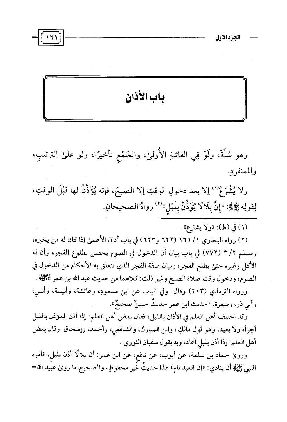 (¬2) رواه البخاري 1/ 161 (622 و 623) في باب أذان الأعمى إذا كان له من يخبره، ومسلم 2/ 3 (772) في باب بيان أن الدخول في الصوم يحصل بطلوع الفجر، وأن له الأكل وغيره حتى يطلع الفجر، وبيان صفة الفجر الذي تتعلق به الأحكام من الدخول في الصوم، ودخول وقت صلاة الصبح وغير ذلك: كلاهما من حديث عبد اللَّه بن عمر -رضي اللَّه عنهما-.