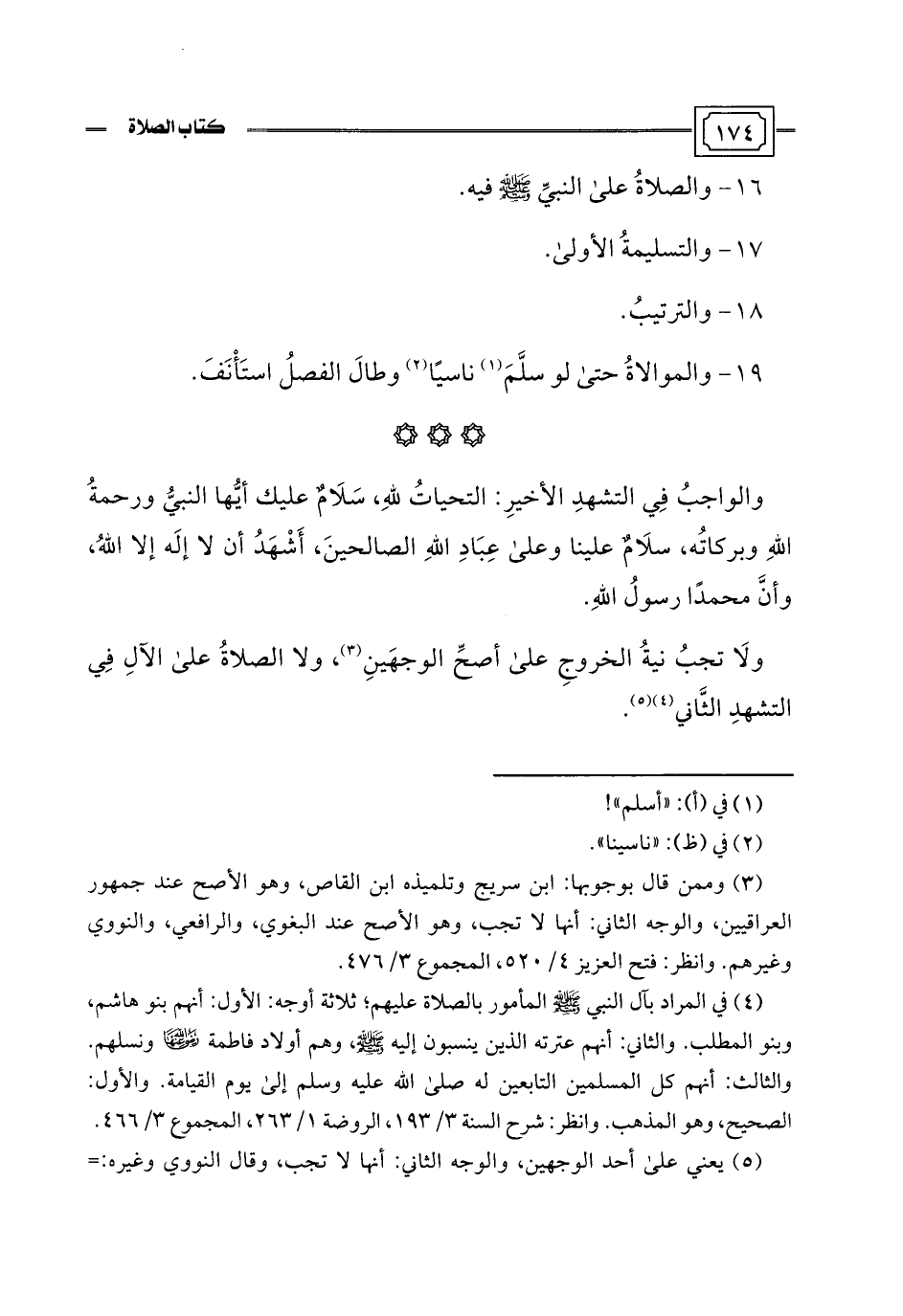 (¬4) في المراد بآل النبي -صلى اللَّه عليه وسلم- المأمور بالصلاة عليهم؛ ثلاثة أوجه: الأول: أنهم بنو هاشم، وبنو المطلب. والثاني: أنهم عترته الذين ينسبون إليه -صلى اللَّه عليه وسلم-، وهم أولاد فاطمة -رضي اللَّه عنهما- ونسلهم. والثالث: أنهم كل المسلمين التابعين له صلى اللَّه عليه وسلم إلى يوم القيامة. والأول: الصحيح، وهو المذهب. وانظر: شرح السنة 3/ 193، الروضة 1/ 263، المجموع 3/ 466.