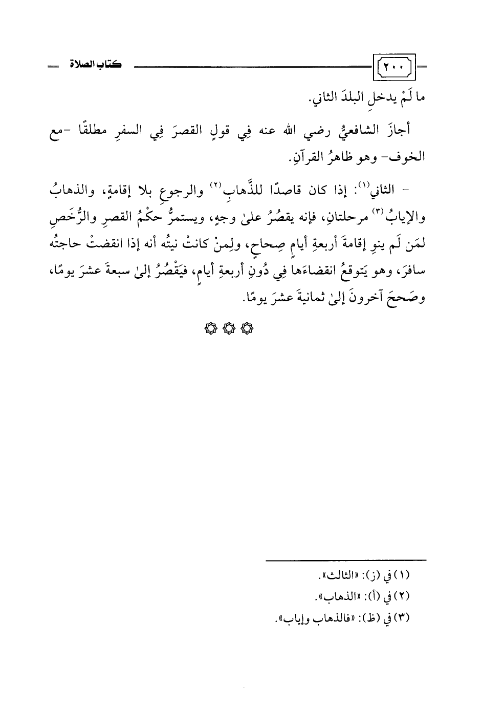 - الثاني (¬1): إذا كان قاصدًا للذَّهابِ (¬2) والرجوعِ بلا إقامةٍ، والذهابُ والإيابُ (¬3) مرحلتانِ، فإنه يقصُرُ على وجهٍ، ويستمرُّ حكْمُ القصرِ والرُّخَصِ لمَن لَم ينوِ إقامةَ أربعةِ أيامٍ صِحاحٍ، ولِمنْ كانتْ نيتُه أنه إذا انقضتْ حاجتُه سافرَ، وهو يَتوقعُ انقضاءَها فِي دُونِ أربعةِ أيامٍ، فيَقْصُرُ إلى سبعةَ عشرَ يومًا، وصَححَ آخرونَ إلى ثمانيةَ عشرَ يومًا.