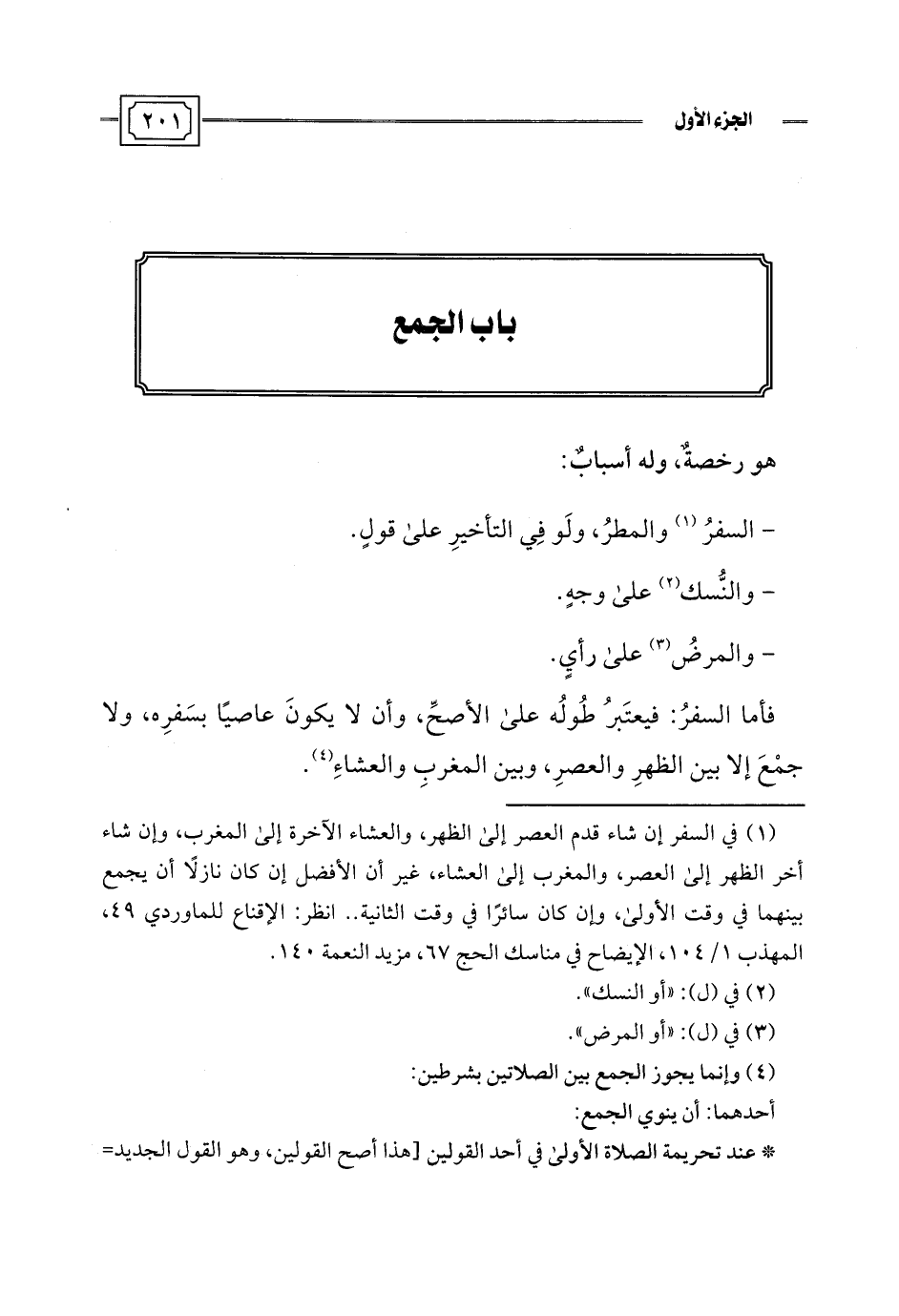 (¬1) في السفر إن شاء قدم العصر إلى الظهر، والعشاء الآخرة إلى المغرب، وإن شاء أخر الظهر إلى العصر، والمغرب إلى العشاء، غير أن الأفضل إن كان نازلًا أن يجمع بينهما في وقت الأولى، وإن كان سائرًا في وقت الثانية. . انظر: الإقناع للماوردي 49، المهذب 1/ 104، الإيضاح في مناسك الحج 67، مزيد النعمة 140.