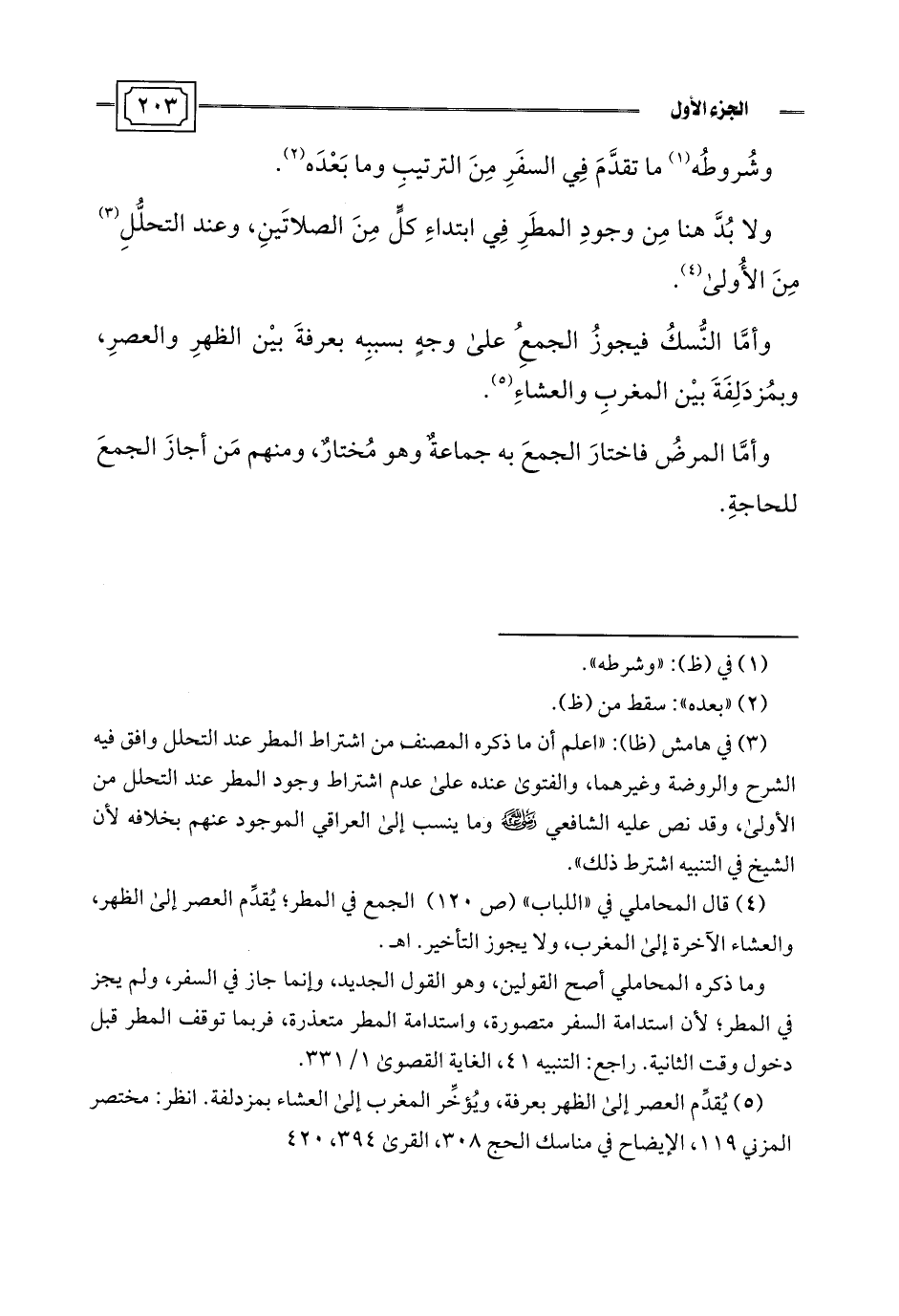 (¬3) في هامش (ظا): "اعلم أن ما ذكره المصنف من اشتراط المطر عند التحلل وافق فيه الشرح والروضة وغيرهما، والفتوى عنده على عدم اشتراط وجود المطر عند التحلل من الأولى، وقد نص عليه الشافعي -رضي اللَّه عنه- وما ينسب إلى العراقي الموجود عنهم بخلافه لأن الشيخ في التنبيه اشترط ذلك".