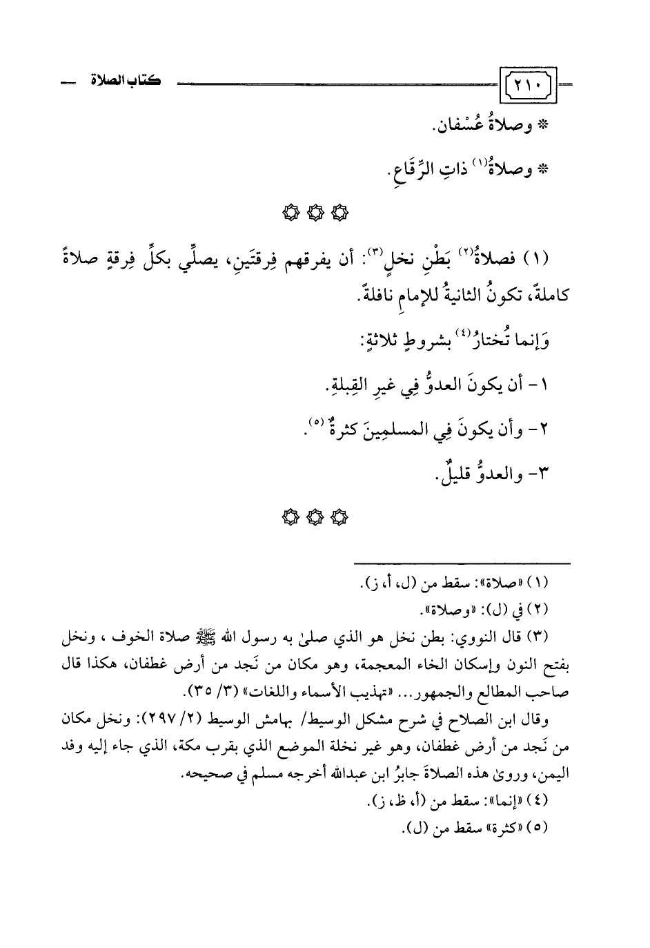 (1) فصلاةُ (¬2) بَطْنِ نخلٍ (¬3): أن يفرقهم فِرقتَينِ، يصلِّي بكلِّ فِرقةٍ صلاةً كاملةً، تكونُ الثانيةُ للإمامِ نافلةً.