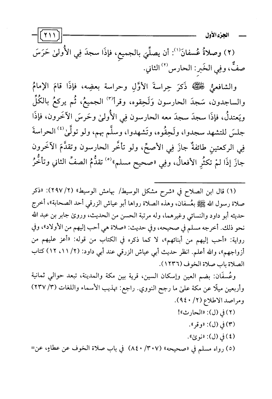 (¬1) قال ابن الصلاح في "شرح مشكل الوسيط/ بهامش الوسيط" (2/ 297): "ذكر صلاة رسول اللَّه -صلى اللَّه عليه وسلم- بعُسفان، وهذه الصلاة رواها أبو عياش الزرقي أحد الصحابة"، أخرج حديثه أبو داود والنسائي وغيرهما، وله مرتبة الحسن من الحديث، وروى جابر بن عبد اللَّه نحو ذلك. أخرجه مسلم في صحيحه، وفي حديث: "صلاة هي أحب إليهم من الأولاد"، وفي رواية: "أحب إليهم من أبنائهم"، لا كما ذكره في الكتاب من قوله: "أعز عليهم من أزواجهم"، واللَّه أعلم. انظر حديث أبي عياش الزرقي عند أبي داود: (2/ 11، 12) كتاب الصلاة باب صلاة الخوف (1236).