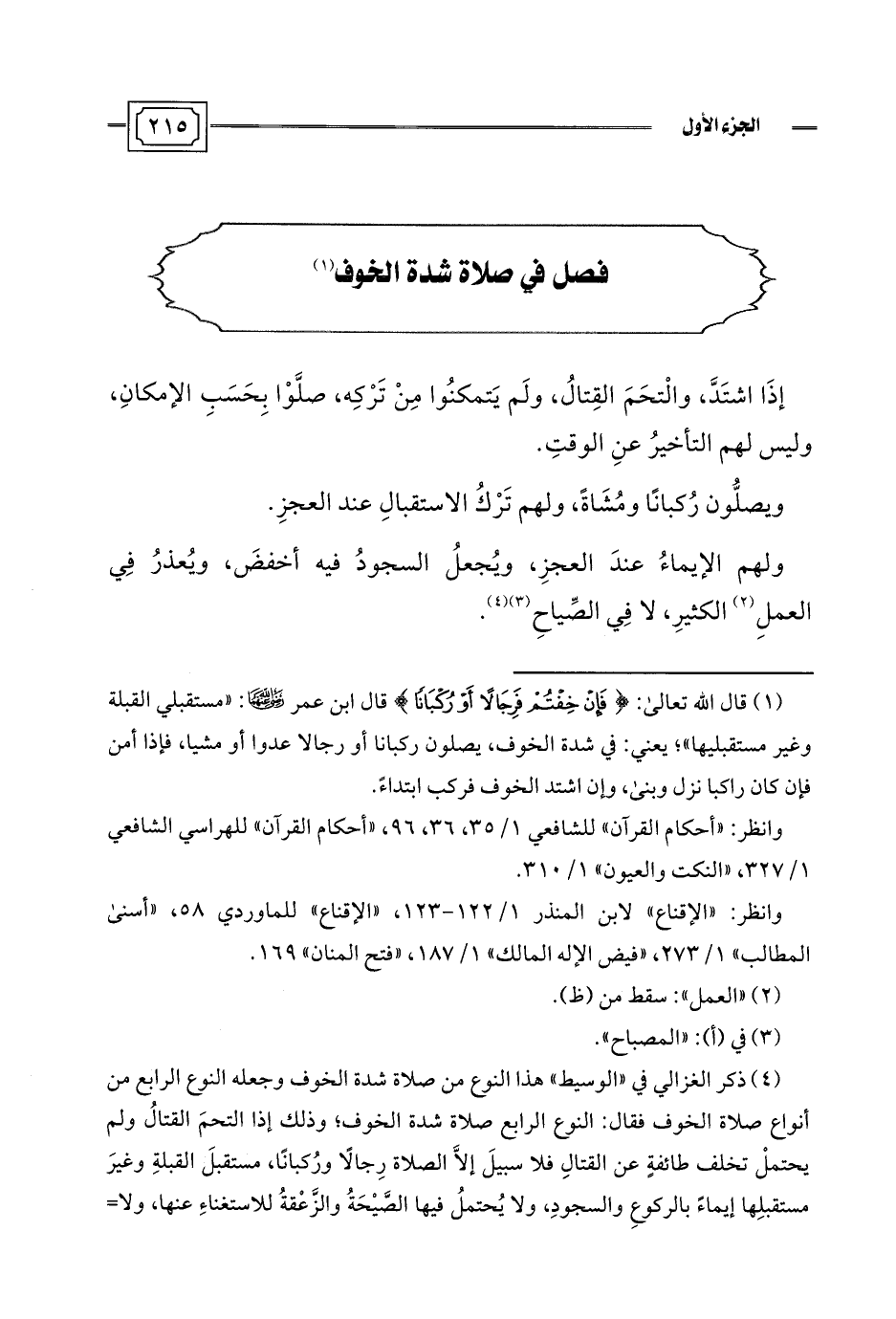 (¬1) قال اللَّه تعالى: {فَإِنْ خِفْتُمْ فَرِجَالًا أَوْ رُكْبَانًا} قال ابن عمر -رضي اللَّه عنهما-: "مستقبلي القبلة وغير مستقبليها"، يعني: في شدة الخوف، يصلون ركبانا أو رجالا عدوا أو مشيا، فإذا أمن فإن كان راكبا نزل وبنى، وإن اشتد الخوف فركب ابتداءً.