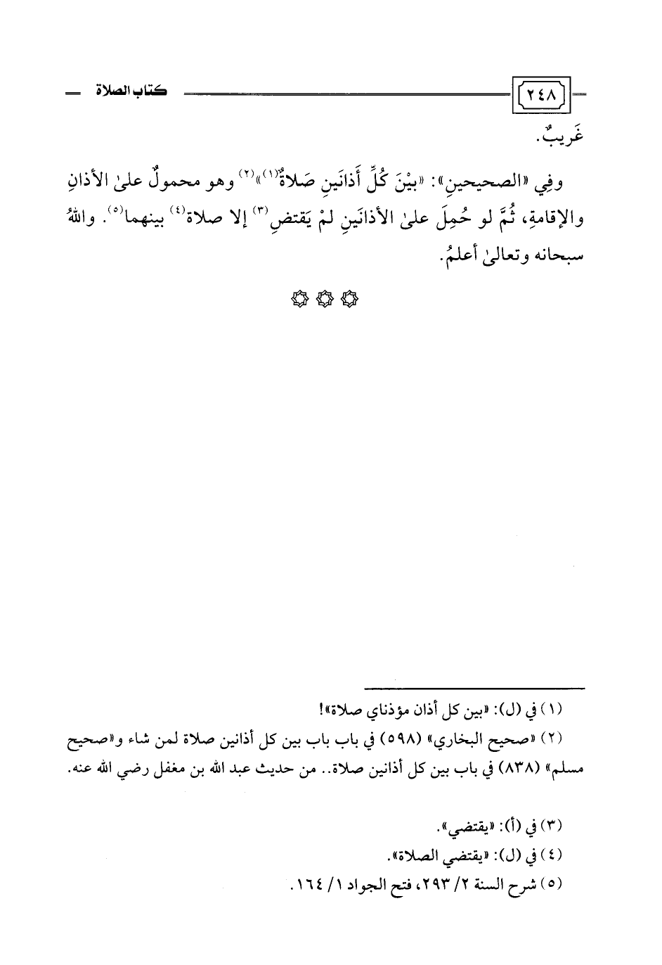 وفِي "الصحيحينِ": "بيْنَ كُلِّ أَذانَينِ صَلاةٌ (¬1) " (¬2) وهو محمولٌ على الأذانِ والإقامةِ، ثُمَّ لو حُمِلَ على الأذانَينِ لمْ يَقتضِ (¬3) إلا صلاة (¬4) بينهما (¬5). واللَّهُ سبحانه وتعالى أعلمُ.
