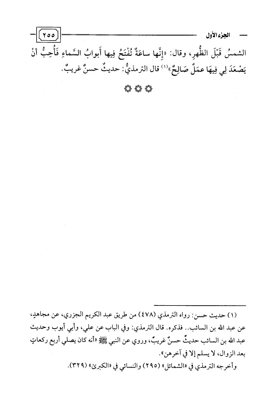 الشمسُ قَبْلَ الظُّهرِ، وقال: "إِنَّها ساعَةٌ تُفْتَحُ فِيها أَبوابُ السَّماءِ فَأحِبُّ أَنْ يَصعَدَ لِي فِيهَا عمَلٌ صَالِحٌ" (¬1) قال الترمذيُّ: حديثٌ حسنٌ غريبٌ.