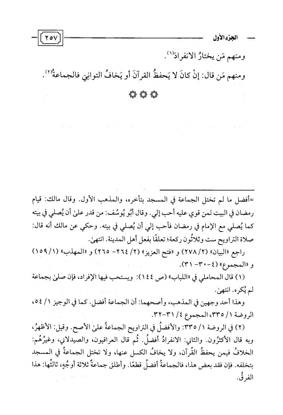 (¬2) في الروضة 1/ 335: والأفضلُ في التراويح الجماعةُ على الأصح. وقيل: الأظهرُ، وبه قال الأكثرُون. والثاني: الانفرادُ أفضلُ. ثُم قال العراقيون، والصيدلاني، وغيرُهُم: الخلافُ فيمن يحفظُ القُرآن، ولا يخافُ الكسل عنها، ولا تختل الجماعةُ في المسجد بتخلفه. فإن فقد بعض هذا، فالجماعةُ أفضلُ قطعًا. وأطلق جماعة ثلاثة أوجُهٍ، ثالثُها: هذا الفرقُ.