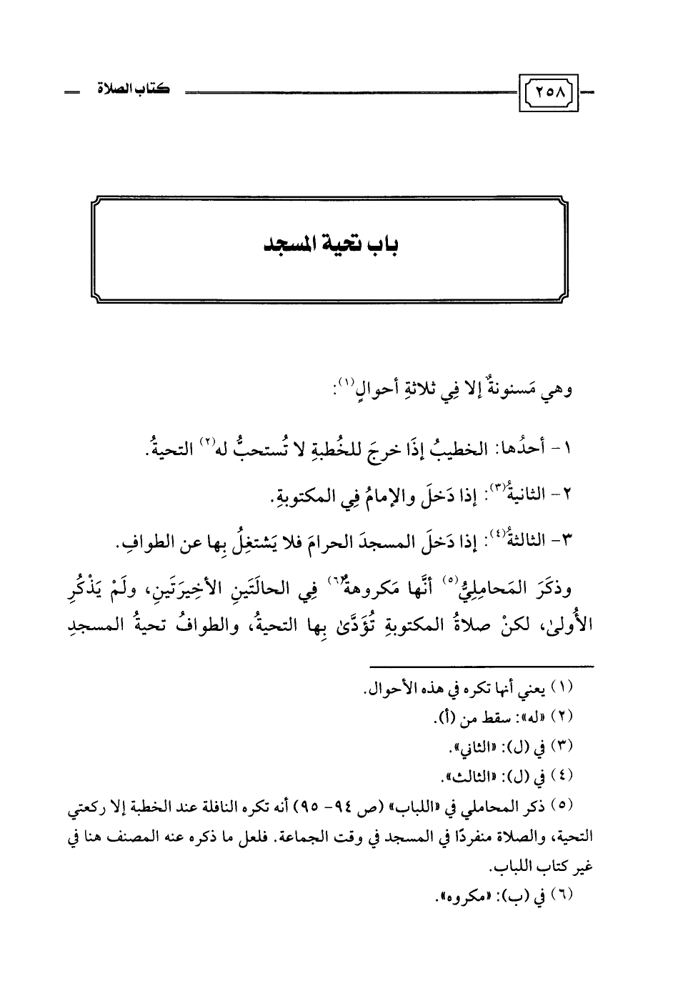 (¬5) ذكر المحاملي في "اللباب" (ص 94 - 95) أنه تكره النافلة عند الخطبة إلا ركعتي التحية، والصلاة منفردًا في المسجد في وقت الجماعة. فلعل ما ذكره عنه المصنف هنا في غير كتاب اللباب.
