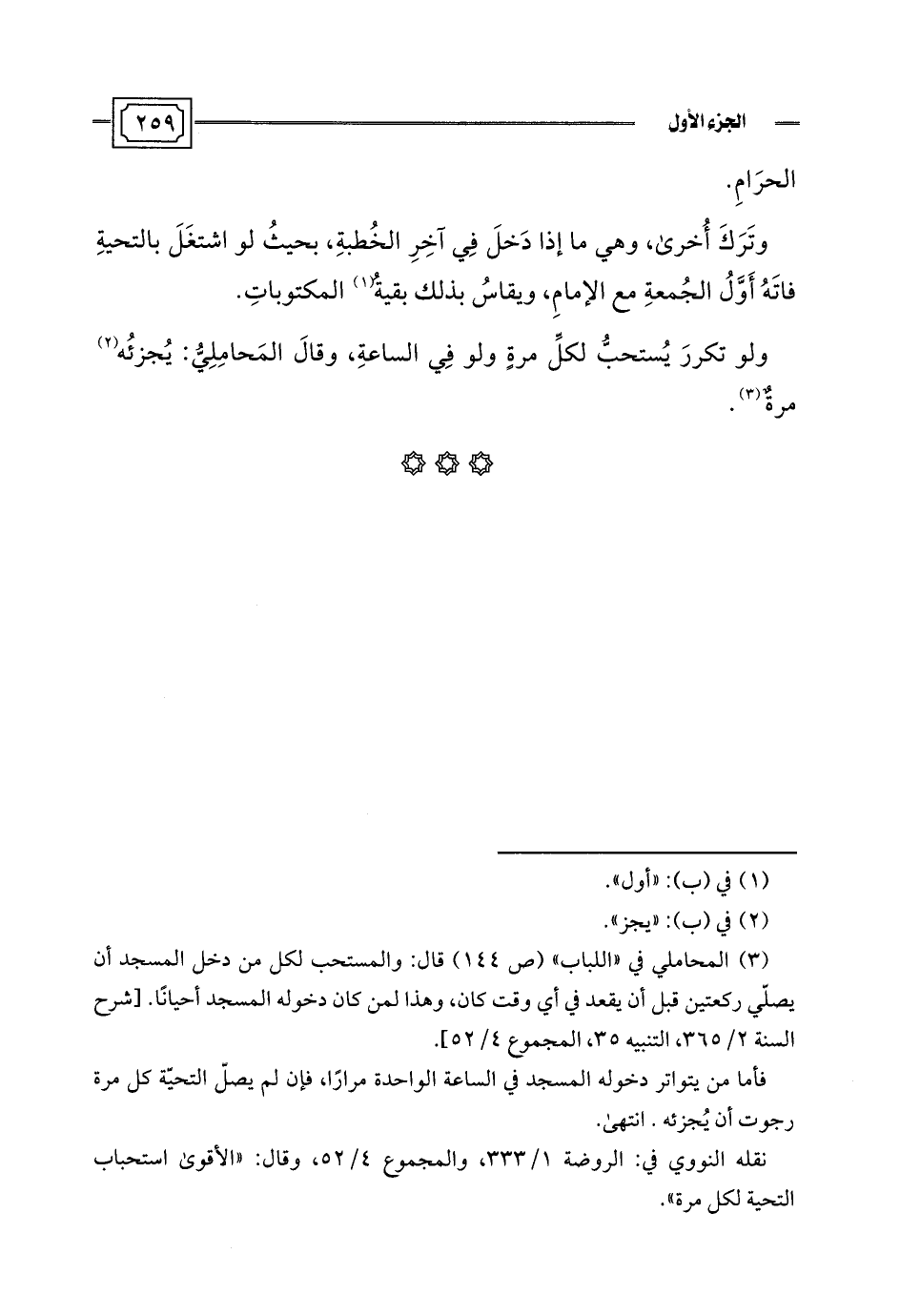 (¬3) المحاملي في "اللباب" (ص 144) قال: والمستحب لكل من دخل المسجد أن يصلّي ركعتين قبل أن يقعد في أي وقت كان، وهذا لمن كان دخوله المسجد أحيانًا. [شرح السنة 2/ 365، التنبيه 35، المجموع 4/ 52].