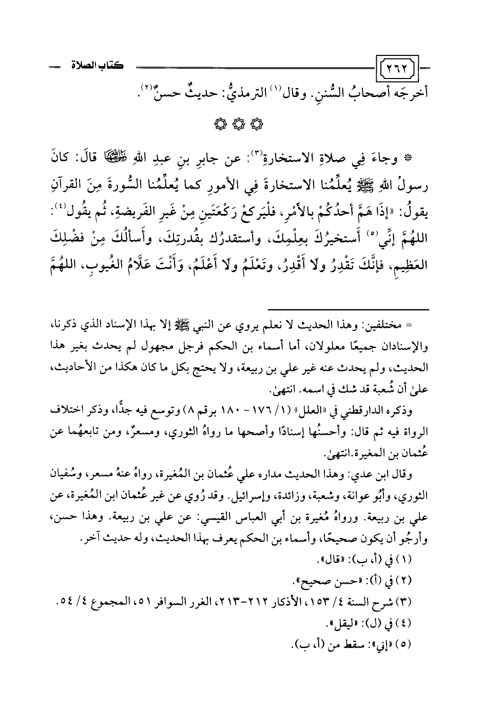 * وجاءَ في صلاةِ الاستخارةِ (¬3): عن جابرِ بنِ عبدِ اللَّهِ -رضي اللَّه عنهما- قالَ: كانَ رسولُ اللَّهِ -صلى اللَّه عليه وسلم- يُعلِّمُنا الاستخارةَ في الأمورِ كما يُعلِّمُنا السُّورةَ مِنَ القرآنِ يقولُ: "إذَا هَمَّ أحدُكُمْ بالأَمْرِ، فلْيَركعْ رَكْعَتَينِ مِنْ غَيرِ الفَريضةِ، ثُم يقُول (¬4): اللهُمَّ إنِّي (¬5) أَستخيرُكَ بعِلْمِكَ، وأستقدرُك بقُدرتِكَ، وأَسألُكَ مِن فضْلِكَ العَظِيمِ، فإنَّكَ تَقْدِرُ ولا أَقْدِرُ، وتَعْلَمُ ولا أَعْلَمُ، وَأَنْتَ عَلَّامُ الغُيوبِ، اللهمَّ