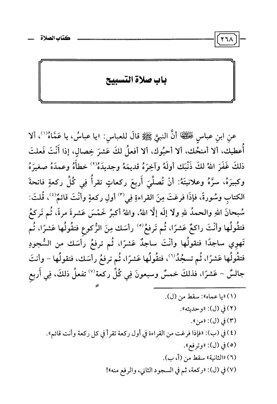 عنِ ابنِ عباسٍ -رضي اللَّه عنهما- أنَّ النبيَّ -صلى اللَّه عليه وسلم- قالَ للعباسِ: "يا عباسُ، يا عَمَّاهُ (¬1)، ألا أُعطيك، ألا أمنحُك، ألا أحبُوك، ألا أفعلُ لكَ عَشرَ خِصالٍ، إذا أَنْتَ فَعلتَ ذلكَ غَفَرَ اللَّهُ لكَ ذَنْبَك أولَهُ وآخِرَهُ قديمَهُ وجديدَهُ (¬2) خطأَهُ وعمدَهُ صغيرَهُ وكبيرَهُ، سرَّهُ وعلانيتَهُ: أَنْ تُصلِّيَ أَربعَ ركعاتٍ تقرأُ في كُلِّ ركعةٍ فاتحةَ الكتابِ وسُورةً، فإذَا فرغتَ مِنَ القراءةِ في (¬3) أولِ ركعةٍ وأنْتَ قائمٌ (¬4)، قُلتَ: سُبحانَ اللَّهِ والحمدُ للَّهِ ولا إلَه إلَّا اللَّهُ، واللَّهُ أكبرُ خَمْسَ عَشرةَ مرةً، ثُم تَركعُ فتقُولُها وأنْتَ راكع عَشرًا، ثُم تَرفعُ (¬5) رأسَك مِنَ الرُّكوعِ فتقُولُها عَشرًا، ثُم تَهوِي ساجدًا فتقولُها وأنْتَ ساجد عَشرًا، ثُم ترفعُ رأسَك من السُّجودِ فتقُولُها عَشرًا، ثُم تسجُدُ (¬6)، فتقُولُها عَشرًا، ثُم ترفعُ رأسَك، فتقولُها -وأنتَ جالسٌ- عَشرًا، فذلكَ خمسٌ وسبعونَ في كُلِّ ركعةٍ (¬7) تفعلُ ذلكَ، في أَربعِ