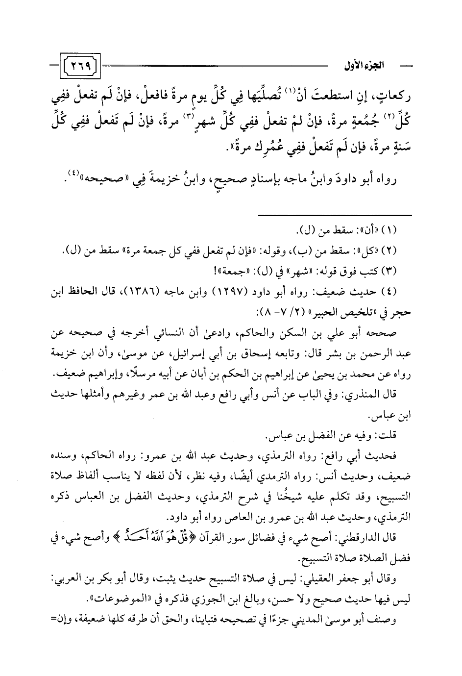 ركعاتٍ، إنِ استطعتَ أَنْ (¬1) تُصلِّيَها في كُلِّ يومٍ مرةً فافعلْ، فإنْ لَم تفعلْ ففِي كُلِّ (¬2) جُمُعةٍ مرةً، فإنْ لمْ تفعلْ ففِي كُلِّ شهرٍ (¬3) مرةً، فإنْ لَم تَفعلْ ففِي كُلِّ سَنةٍ مرةً، فإن لَم تَفعلْ ففِي عُمُرِك مرةً".