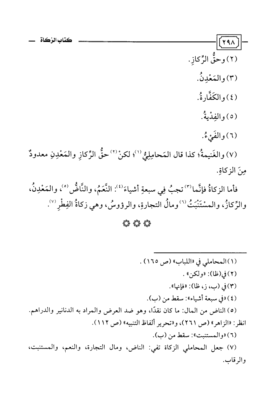 (¬7) جعل المحاملي الزكاة تفي: الناض، ومال التجارة، والنعم، والمستنبت، والرقاب.