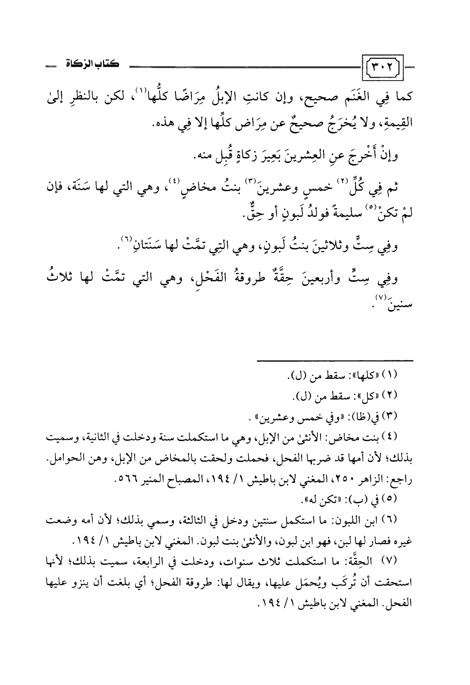 (¬4) بنت مخاض: الأنثى من الإبل، وهي ما استكملت سنة ودخلت في الثانية، وسميت بذلك؛ لأن أمها قد ضربها الفحل، فحملت ولحقت بالمخاض من الإبل، وهن الحوامل. راجع: الزاهر 250، المغني لابن باطيش 1/ 194، المصباح المنير 566.