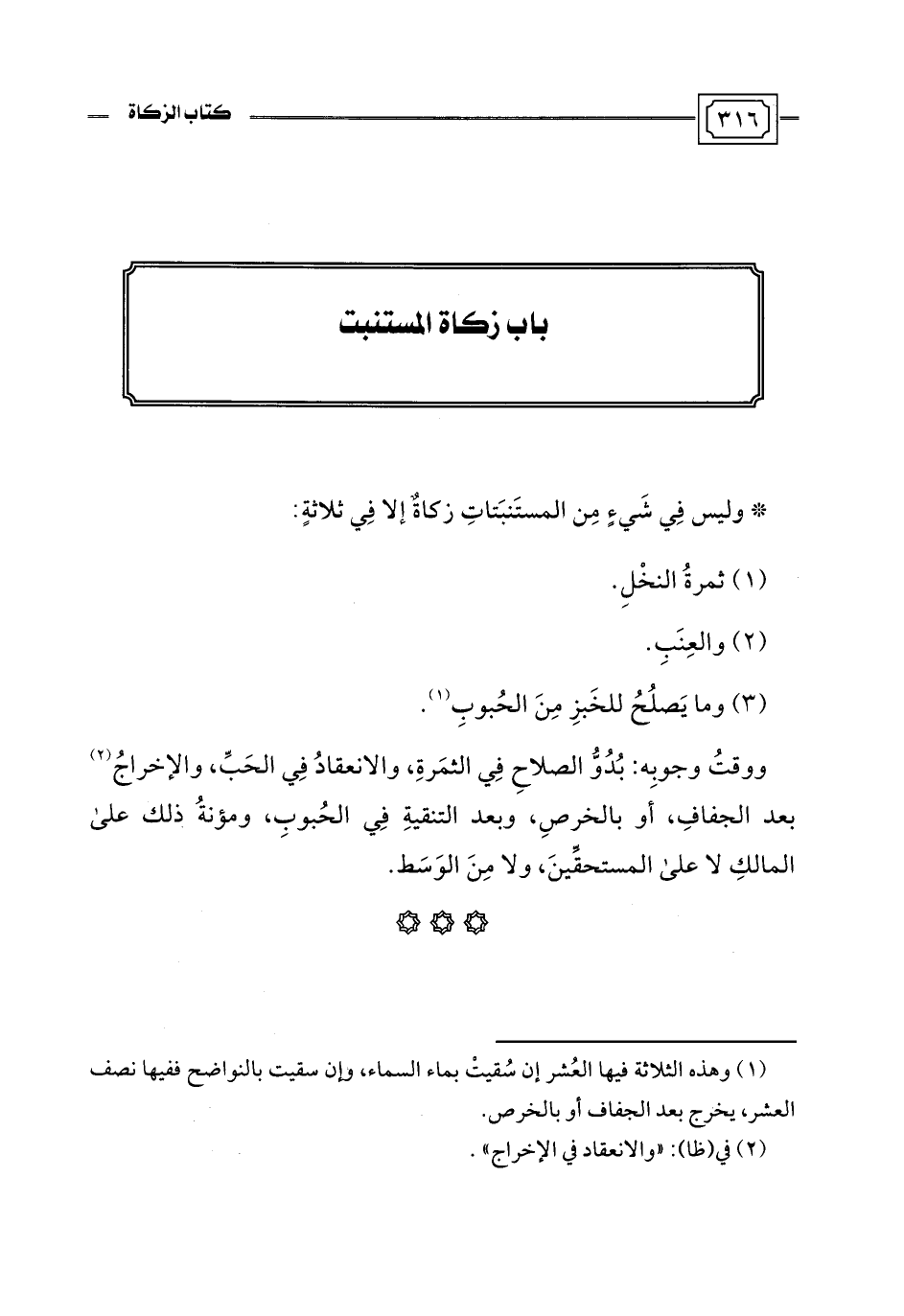 (¬1) وهذه الثلاثة فيها العُشر إن سُقيتْ بماء السماء، وإن سقيت بالنواضح ففيها نصف العشر، يخرج بعد الجفاف أو بالخرص.