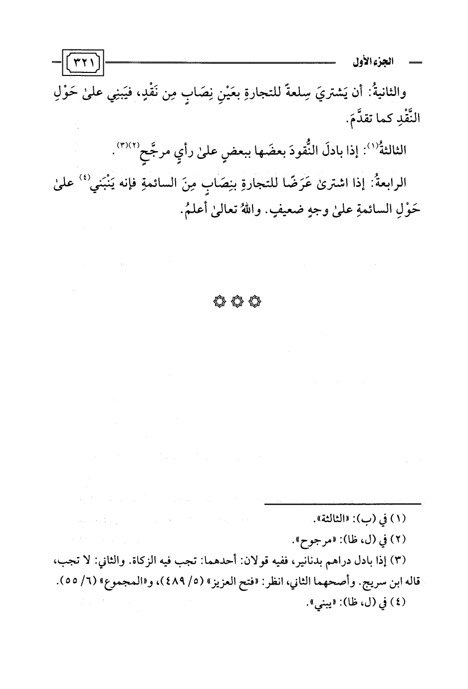(¬3) إذا بادل دراهم بدنانير، ففيه قولان: أحدهما: تجب فيه الزكاة. والثاني: لا تجب، قاله ابن سريج. وأصحهما الثاني، انظر: "فتح العزيز" (5/ 489)، و"المجموع" (6/ 55).