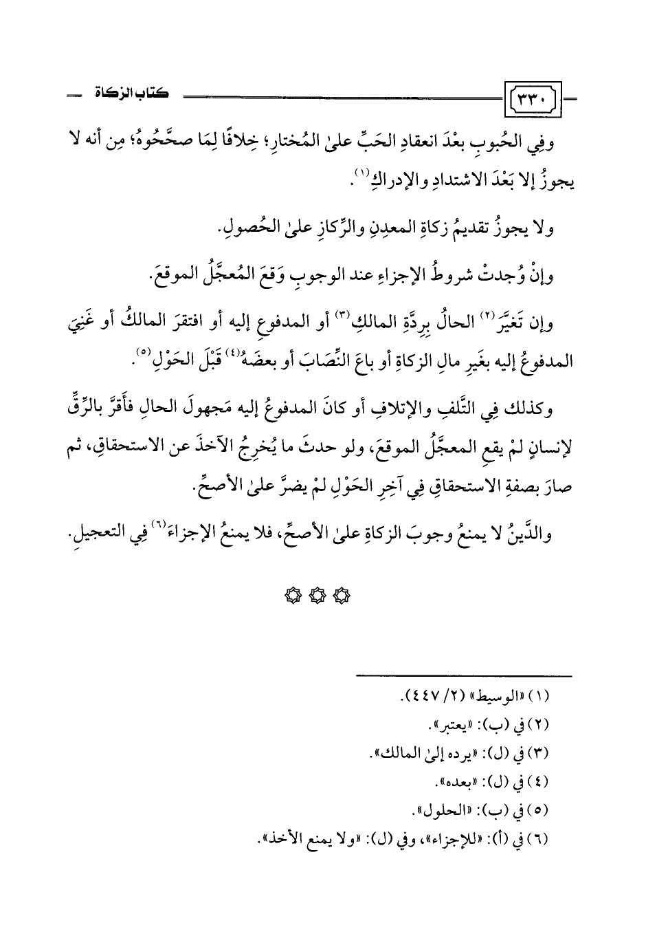 وكذلك في التَّلفِ والإتلافِ أو كانَ المدفوعُ إليه مَجهولَ الحالِ فأَقرَّ بالرِّقِّ لإنسانٍ لمْ يقعِ المعجَّلُ الموقعَ، ولو حدثَ ما يُخرِجُ الآخذَ عن الاستحقاقِ، ثم صارَ بصفةِ الاستحقاقِ في آخِرِ الحَوْلِ لمْ يضرَّ على الأصحِّ.