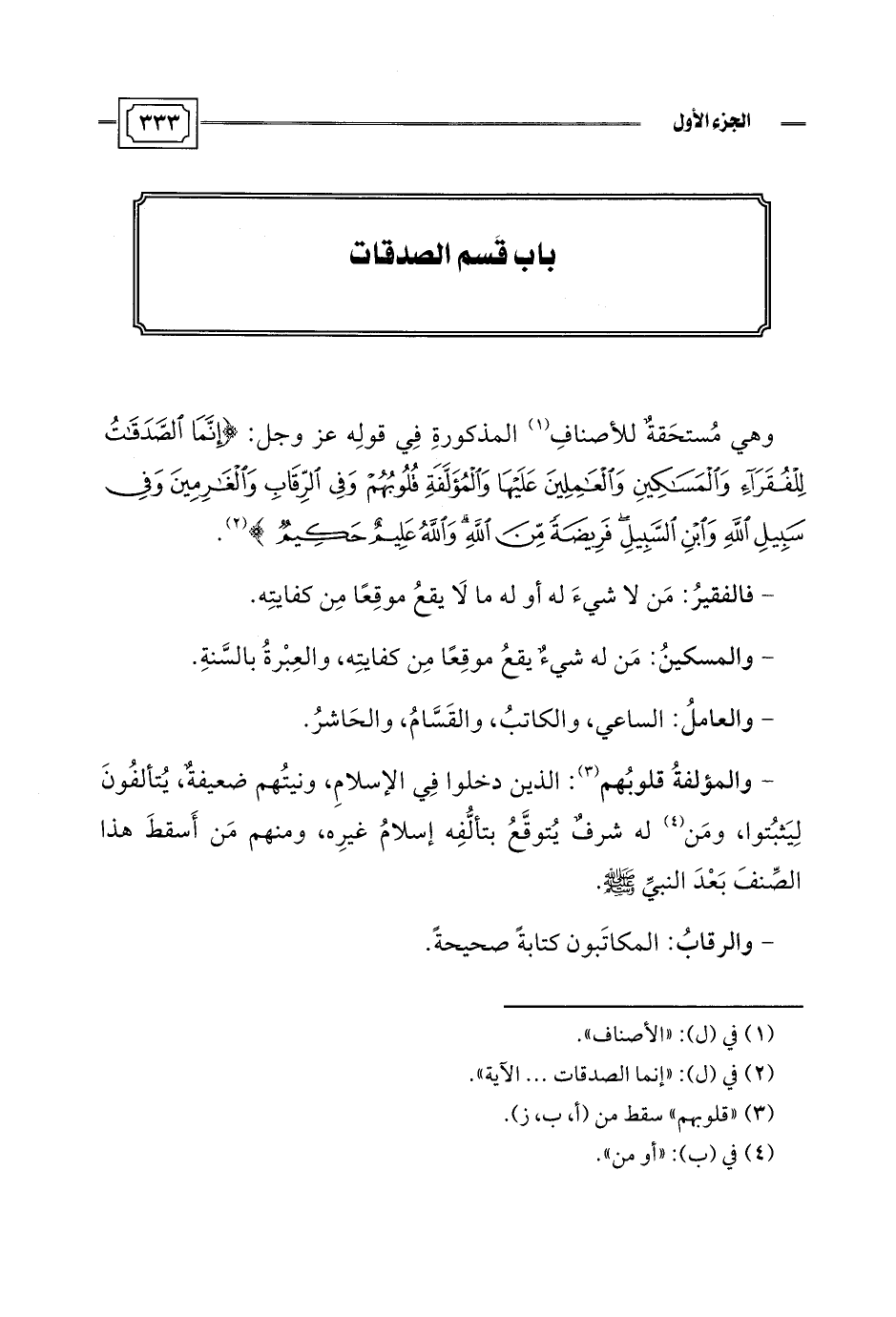 - والمؤلفةُ قلوبُهم (¬3): الذين دخلوا في الإِسلامِ، ونيتُهم ضعيفة، يُتألفُونَ لِيَثبُتوا، ومَن (¬4) له شرفٌ يُتوقَّعُ بتألُّفِه إسلامُ غيرِه، ومنهم مَن أَسقطَ هذا الصِّنفَ بَعْدَ النبيِّ -صلى اللَّه عليه وسلم-.