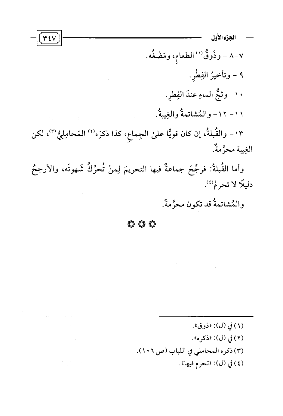 13 - والقُبلةُ، إن كان قويًّا على الجِماعِ، كذا ذكرَه (¬2) المَحامِلِيُّ (¬3)، لكن الغِيبة محرَّمةٌ.