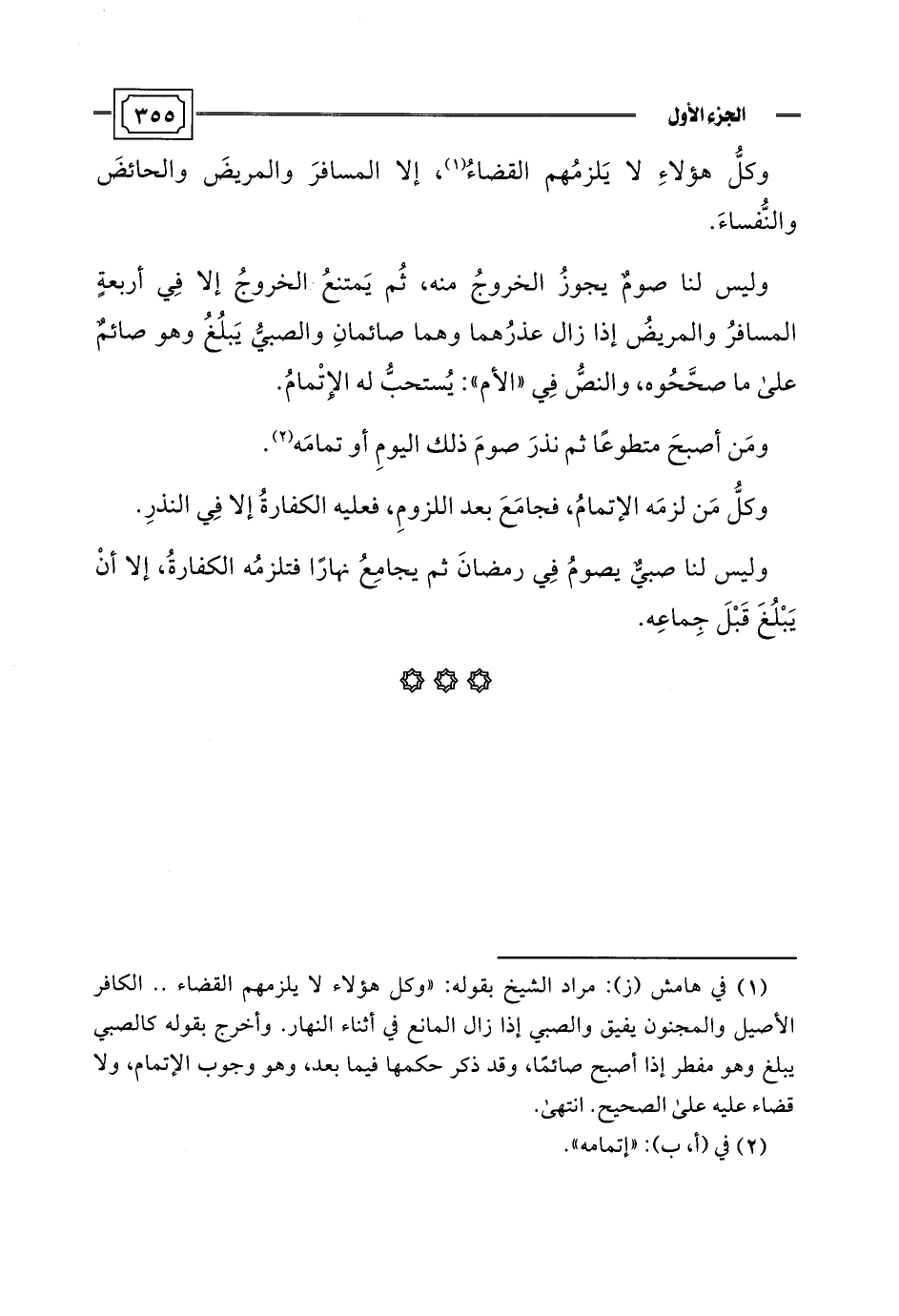 (¬1) في هامش (ز): مراد الشيخ بقوله: "وكل هؤلاء لا يلزمهم القضاء. . الكافر الأصيل والمجنون يفيق والصبي إذا زال المانع في أثناء النهار. وأخرج بقوله كالصبي يبلغ وهو مفطر إذا أصبح صائمًا، وقد ذكر حكمها فيما بعد، وهو وجوب الإتمام، ولا قضاء عليه على الصحيح. انتهى.