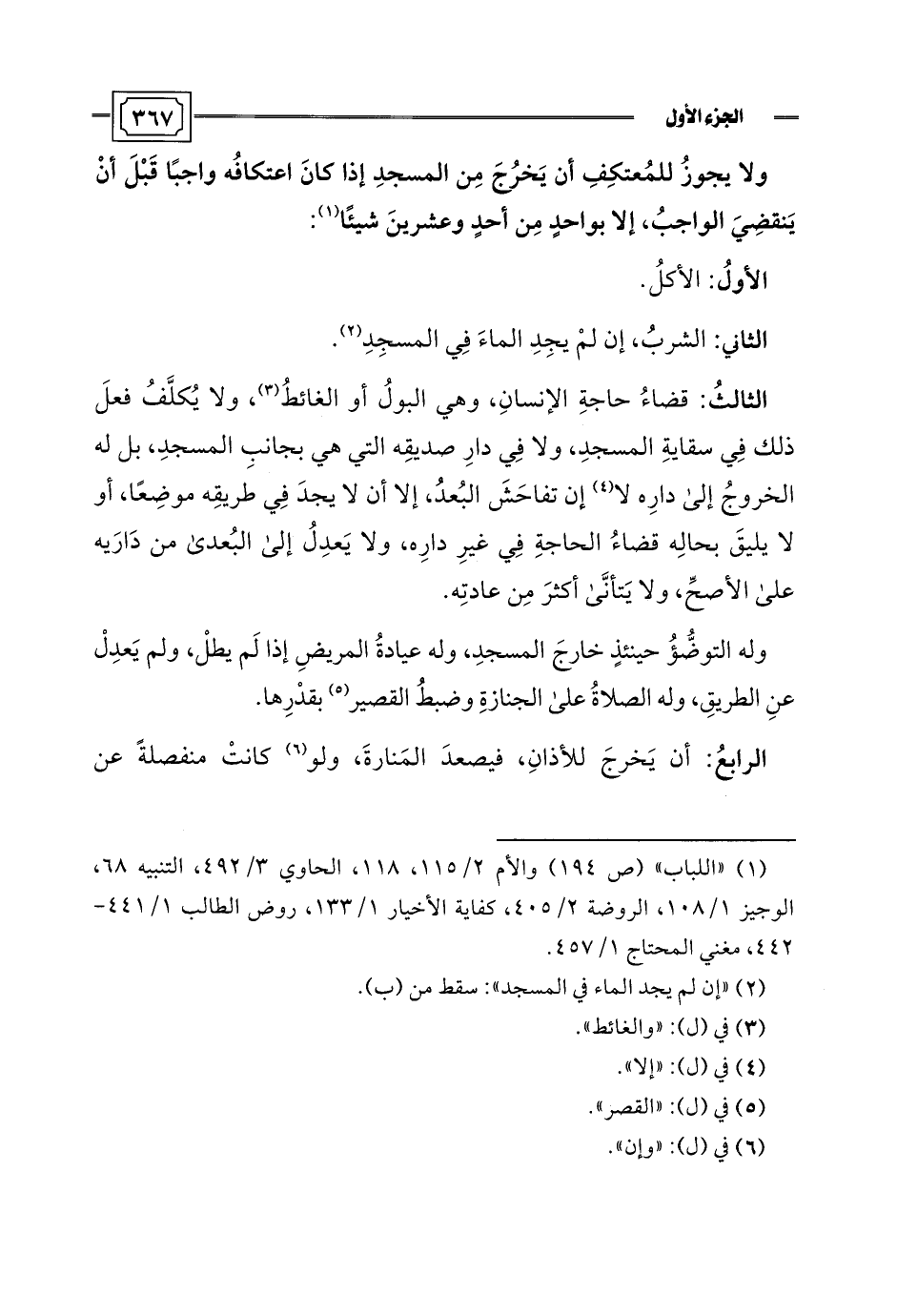 ولا يجوزُ للمُعتكِفِ أن يَخرُجَ مِن المسجدِ إذا كانَ اعتكافُه واجبًا قَبْلَ أَنْ يَنقضِيَ الواجبُ، إلَّا بواحدٍ مِن أحدٍ وعشرينَ شيئًا (¬1):