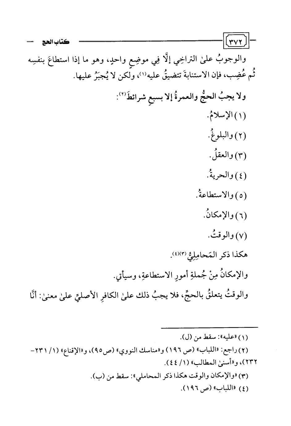 (¬2) راجع: "اللباب" (ص 196) و"مناسك النووي" (ص 95)، و"الإقناع" (1/ 231 - 232)، و"أسنى المطالب" (1/ 44).