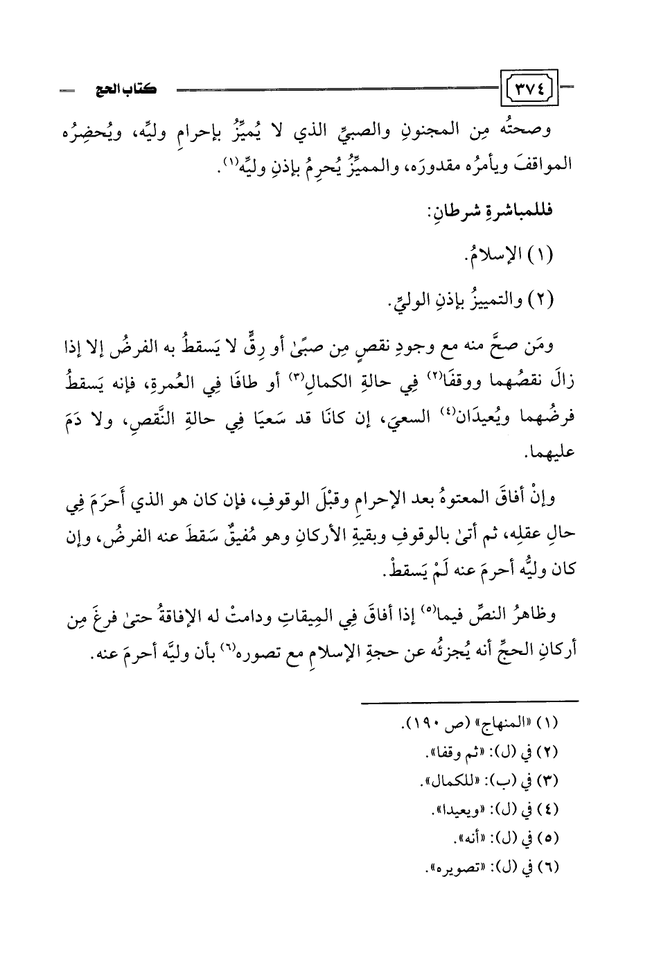 ومَن صحَّ منه مع وجودِ نقصٍ مِن صبًى أو رِقً لا يَسقطُ به الفرضُ إلَّا إذا زالَ نقصُهما ووقفَا (¬2) في حالةِ الكمالِ (¬3) أو طافَا في العُمرةِ، فإنه يَسقطُ فرضُهما ويُعيدَان (¬4) السعيَ، إن كانَا قد سَعيَا في حالةِ النَّقصِ، ولا دَمَ عليهما.
