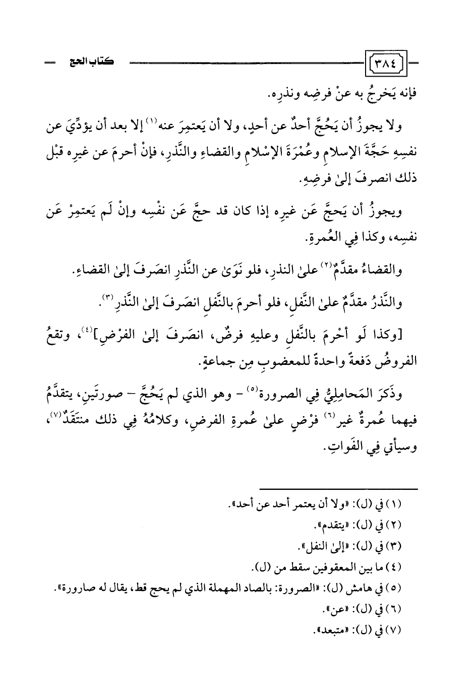 ولا يجوزُ أن يَحُجَّ أحدٌ عن أحدٍ، ولا أن يَعتمِرَ عنه (¬1) إلَّا بعد أن يؤدِّيَ عن نفسِهِ حَجَّةَ الإسلامِ وعُمْرَةَ الإسْلامِ والقضاءِ والنَّذرِ، فَإِنْ أحرمَ عن غيرِه قبْل ذلك انصرفَ إلى فرضِهِ.