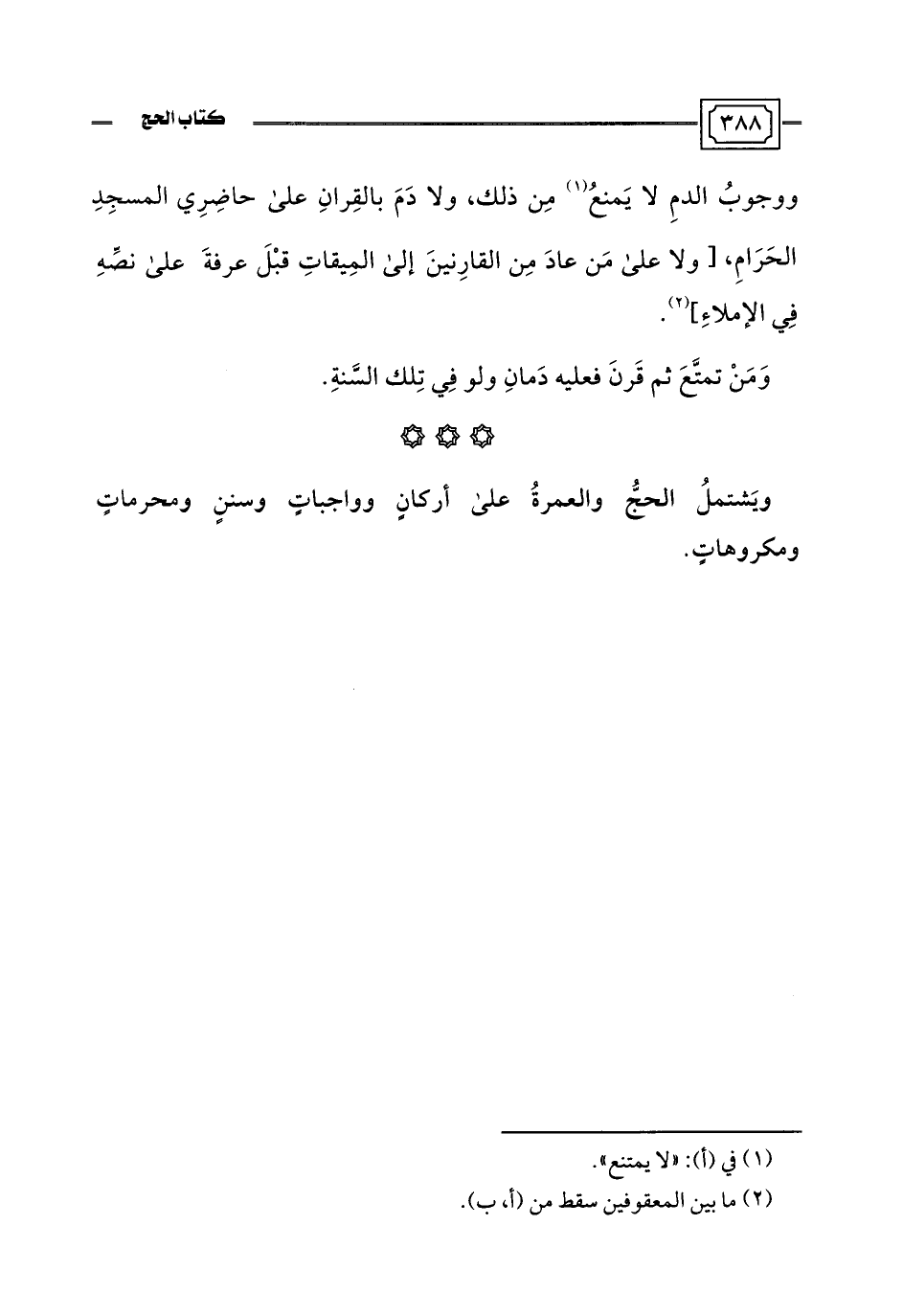 ووجوبُ الدمِ لا يَمنعُ (¬1) مِن ذلك، ولا دَمَ بالقِرانِ على حاضِرِي المسجِدِ الحَرَامِ، [ولا على مَن عادَ مِن القارِنينَ إلى المِيقاتِ قبْلَ عرفةَ على نصِّهِ في الإملاءِ] (¬2).