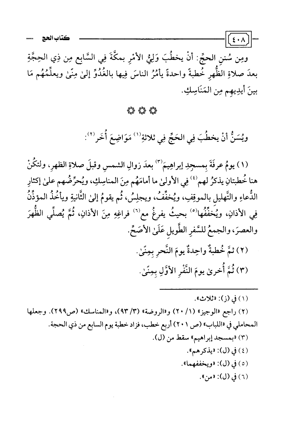 (¬2) راجع "الوجيز" (1/ 20) و"الروضة" (3/ 93)، و"المناسك" (ص 299). وجعلها المحاملي في "اللباب" (ص 201) أربع خطب، فزاد خطبة يوم السابع من ذي الحجة.