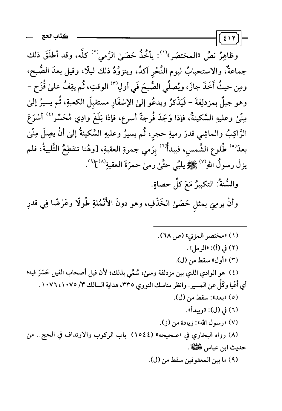 (¬4) هو الوادي الذي بين مزدلفة ومنى، سُمِّي بذلك؛ لأن فيل أصحاب الفيل حَسَرَ فيه؛ أي أَعْيا وكَّل عن المسير. وانظر مناسك النووي 335، هداية السالك 3/ 1075، 1076.
