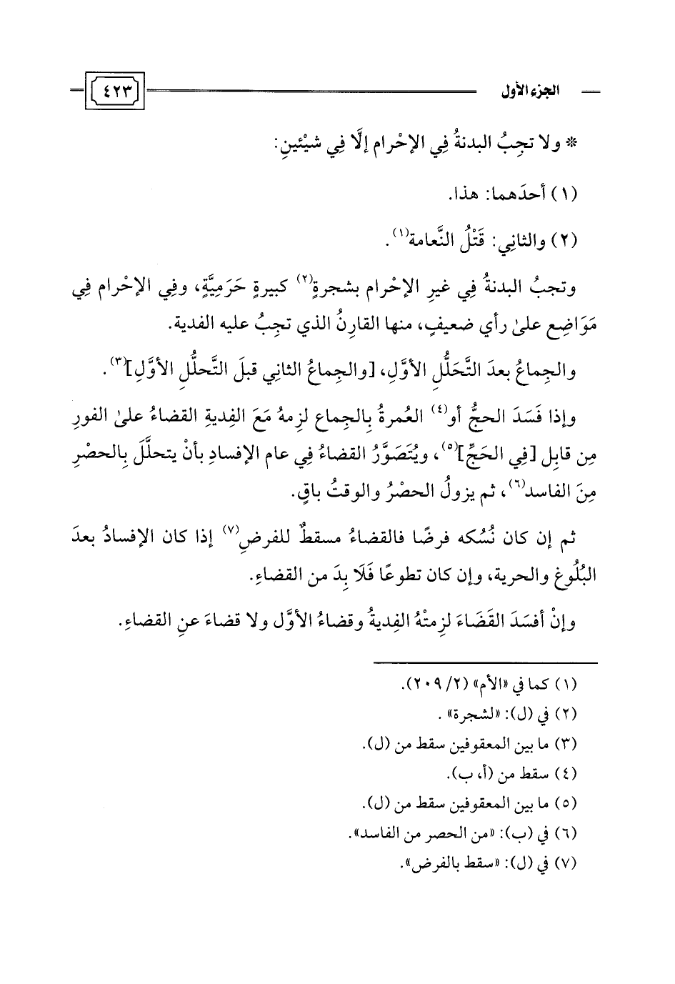* ولا تجِبُ البدنةُ فِي الإحْرام إلَّا فِي شيْئينِ: