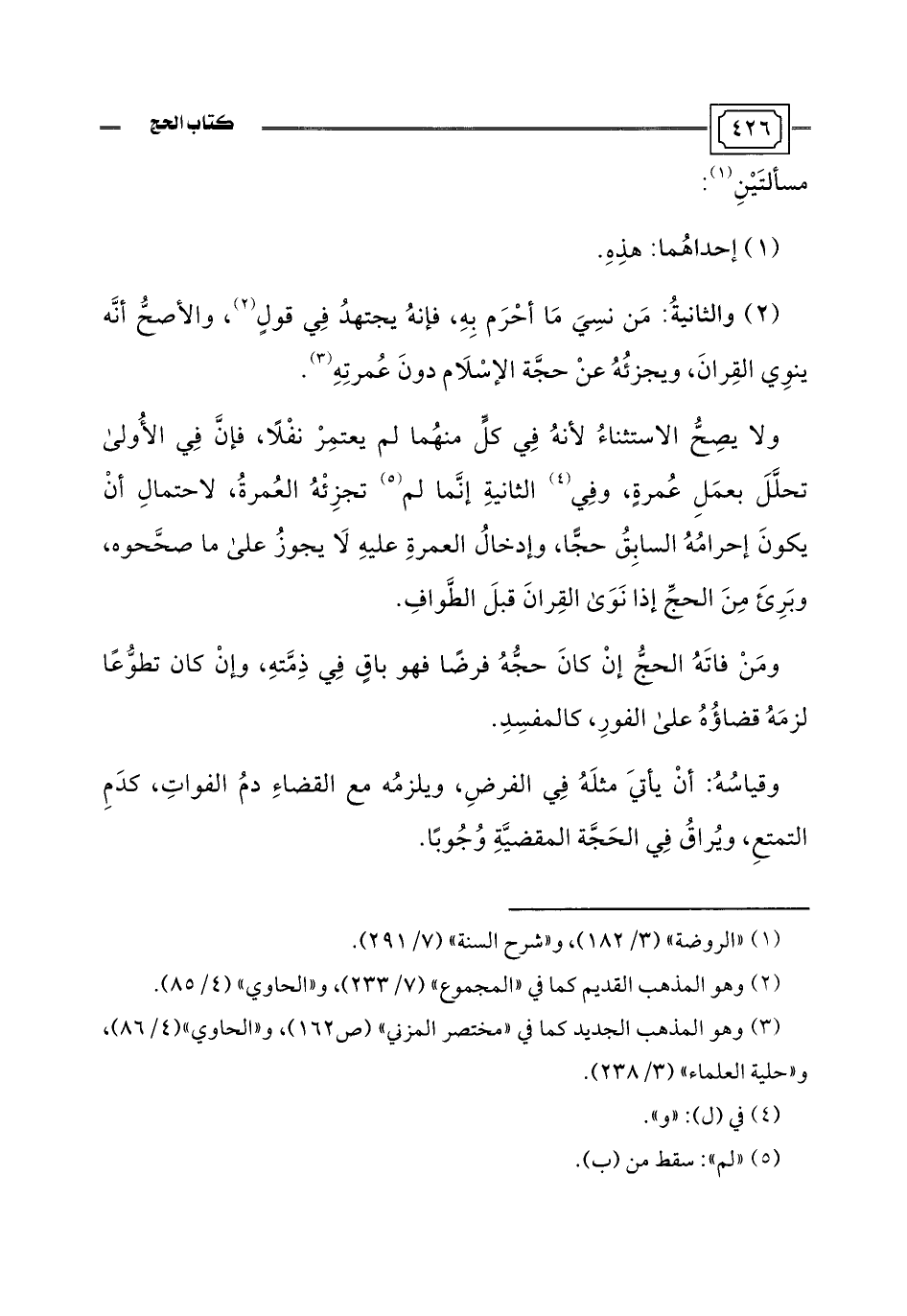 (2) والثانيةُ: مَن نسِيَ مَا أحْرَم بِهِ، فإنهُ يجتهدُ فِي قولٍ (¬2)، والأصحُّ أنَّه ينوِي القِرانَ، ويجزئُهُ عنْ حجَّة الإسْلَام دونَ عُمرتِهِ (¬3).