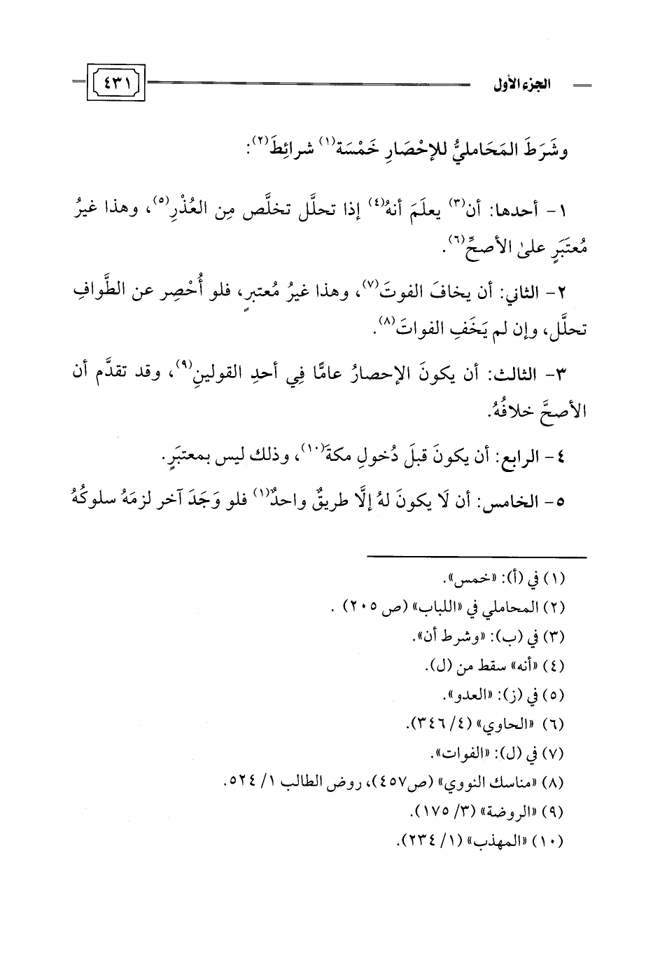 وشَرَطَ المَحَامليُّ للإحْصَارِ خَمْسَة (¬1) شرائِطَ (¬2):