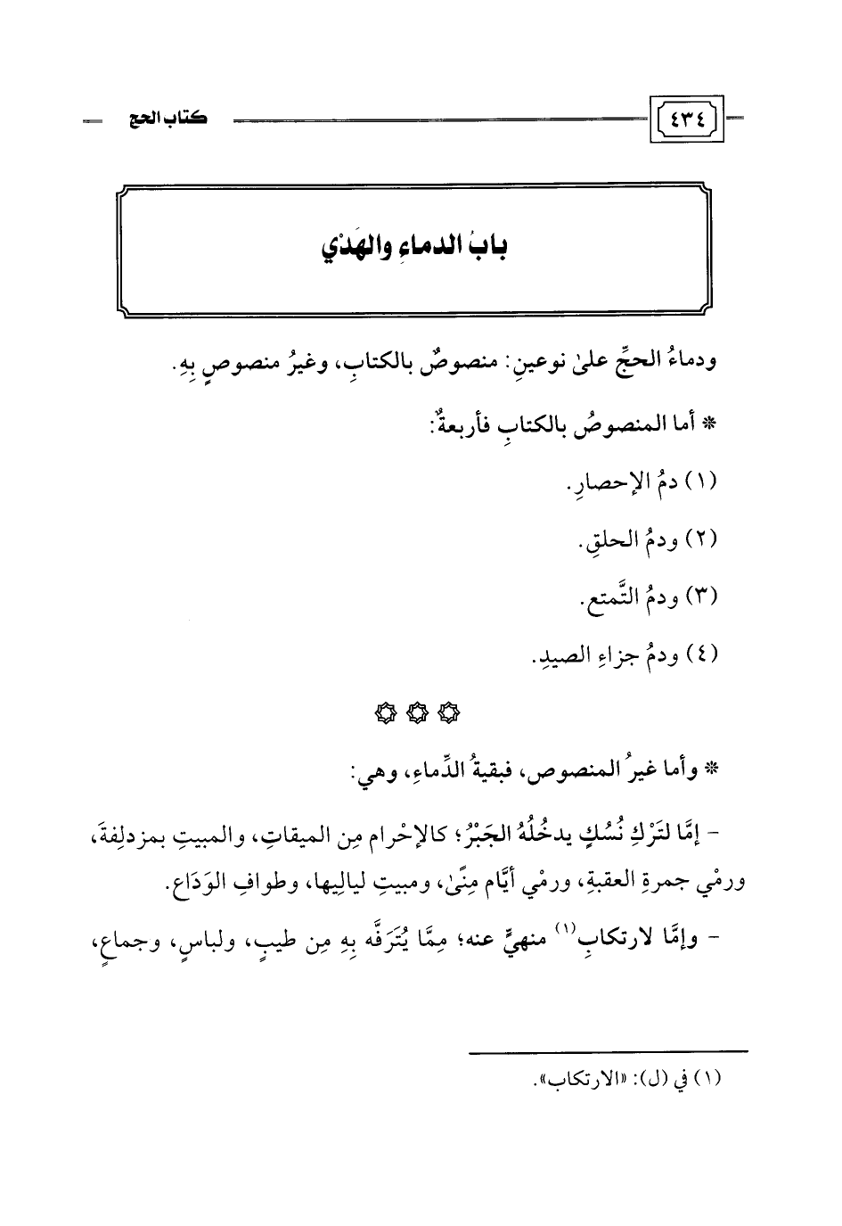 ودماءُ الحجِّ على نوعينِ: منصوصٌ بالكتابِ، وغيرُ منصوصٍ بِهِ.